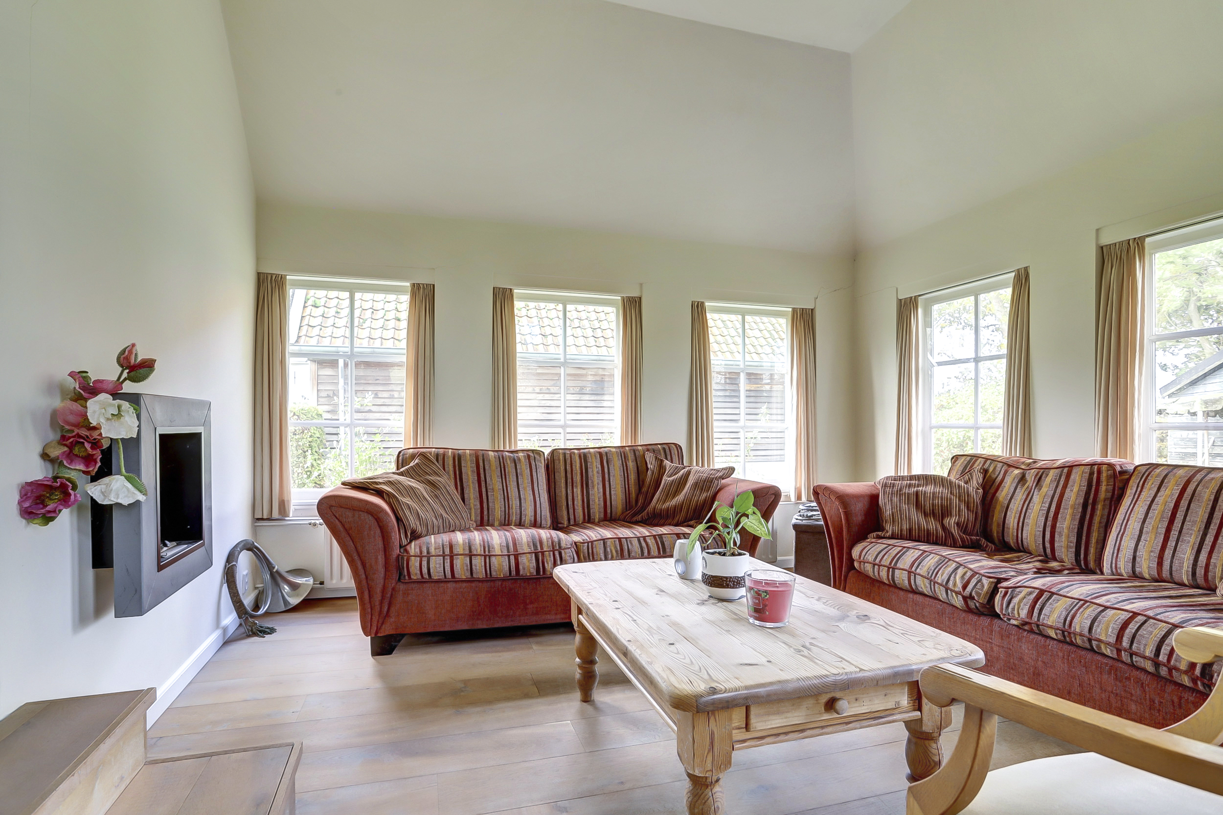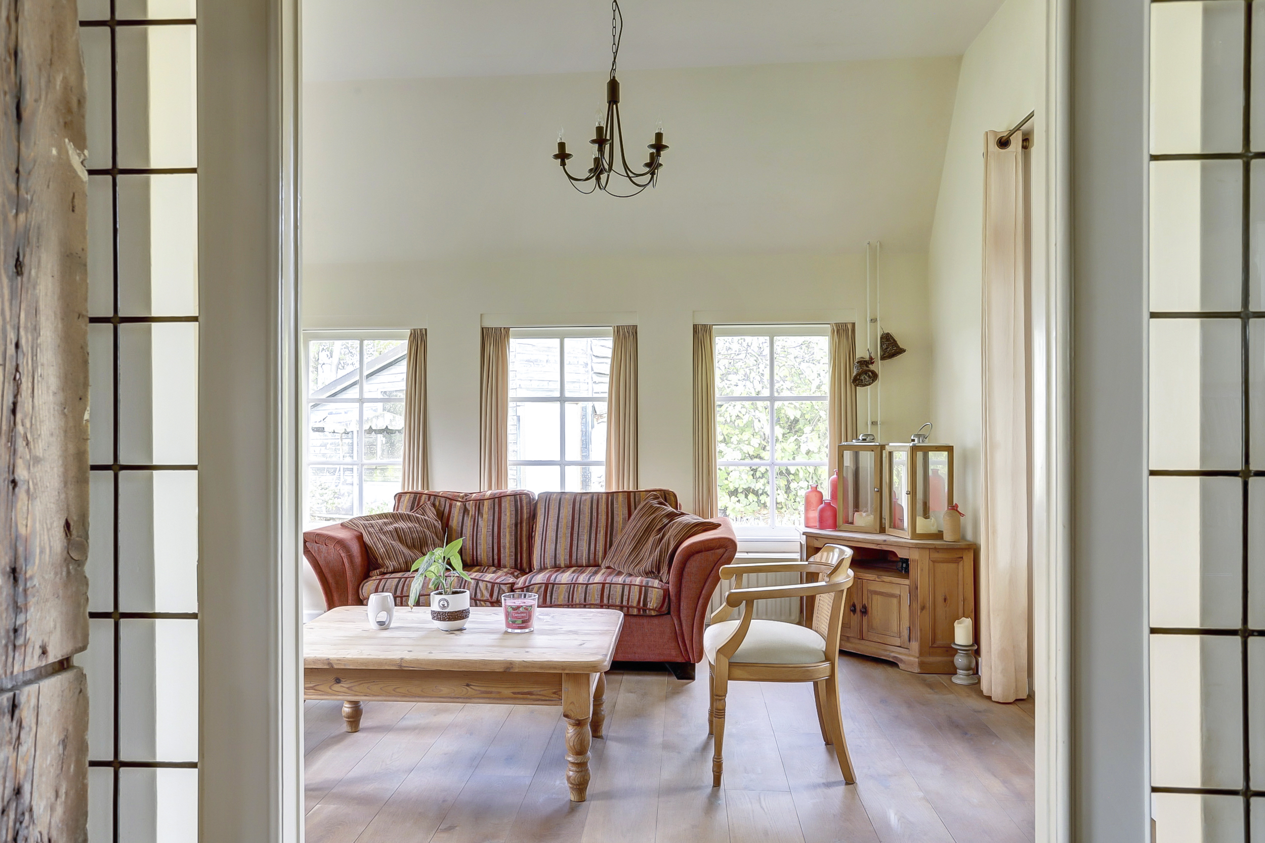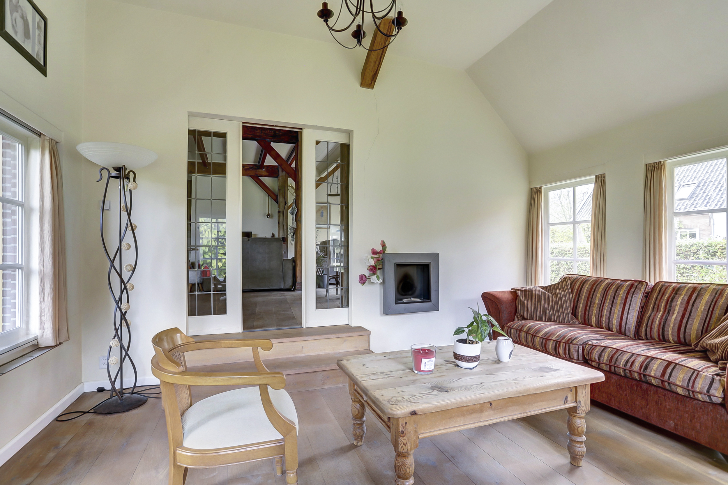 De woonkamer beschikt over openslaande tuindeuren naar het terras onder de fraaie Gelderse overstek. Via glas-in-lood schuifdeuren is de tuinkamer bereikbaar, eveneens met toegang tot het terras.