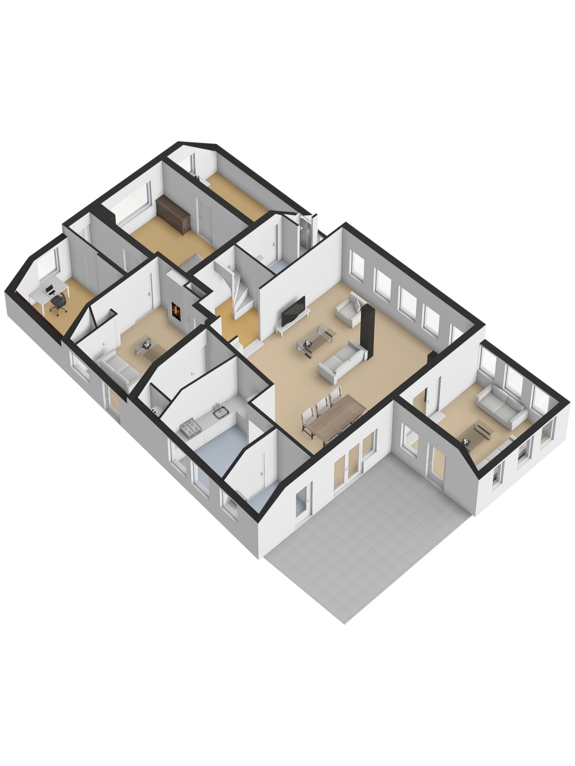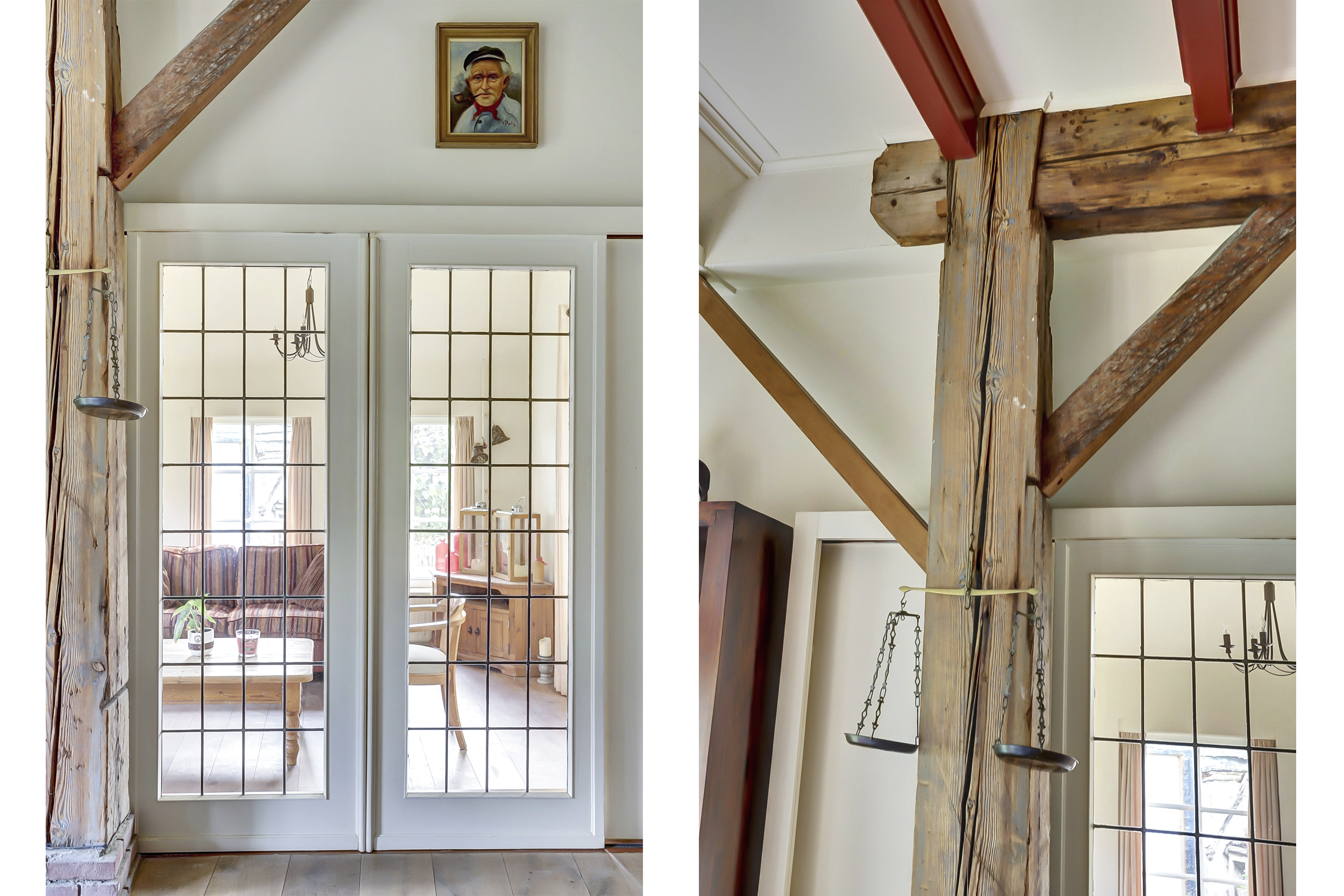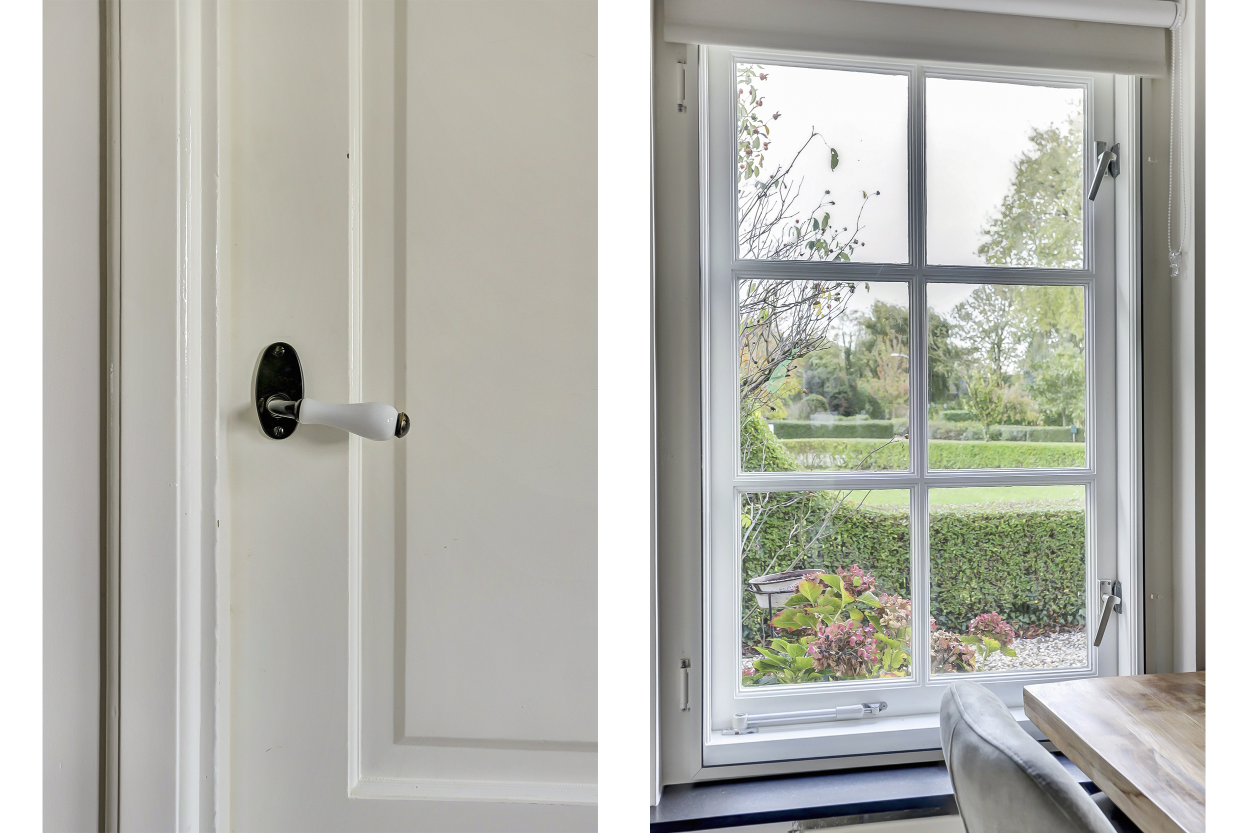 De woonkamer beschikt over openslaande tuindeuren naar het terras onder de fraaie Gelderse overstek. Via glas-in-lood schuifdeuren is de tuinkamer bereikbaar, eveneens met toegang tot het terras.