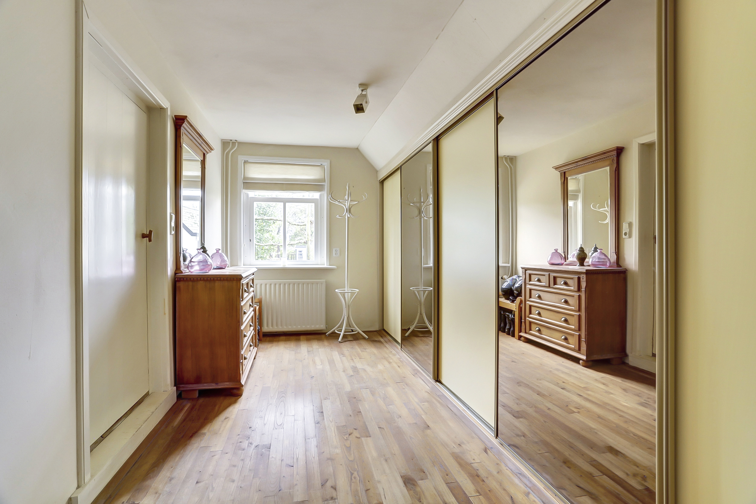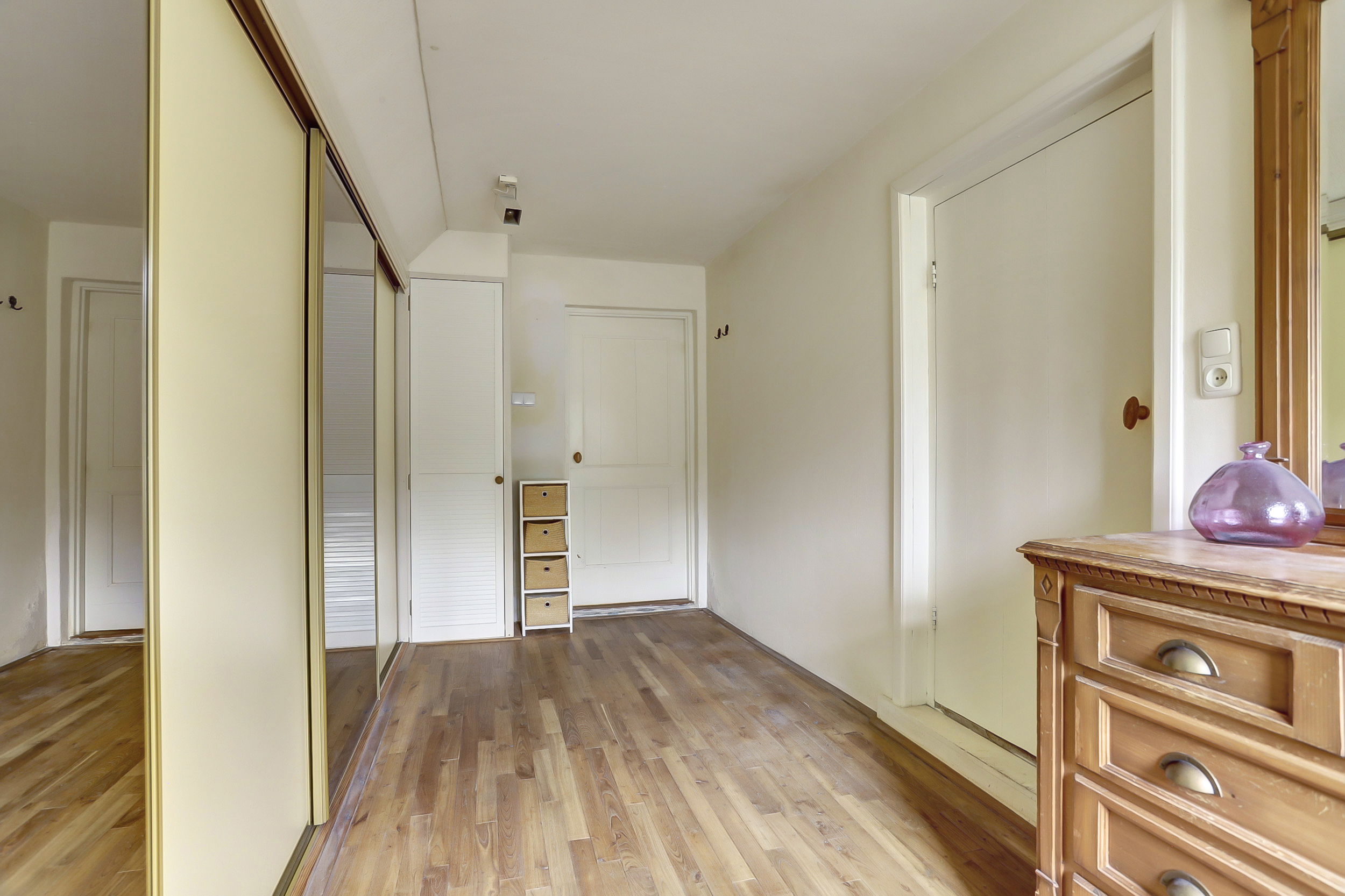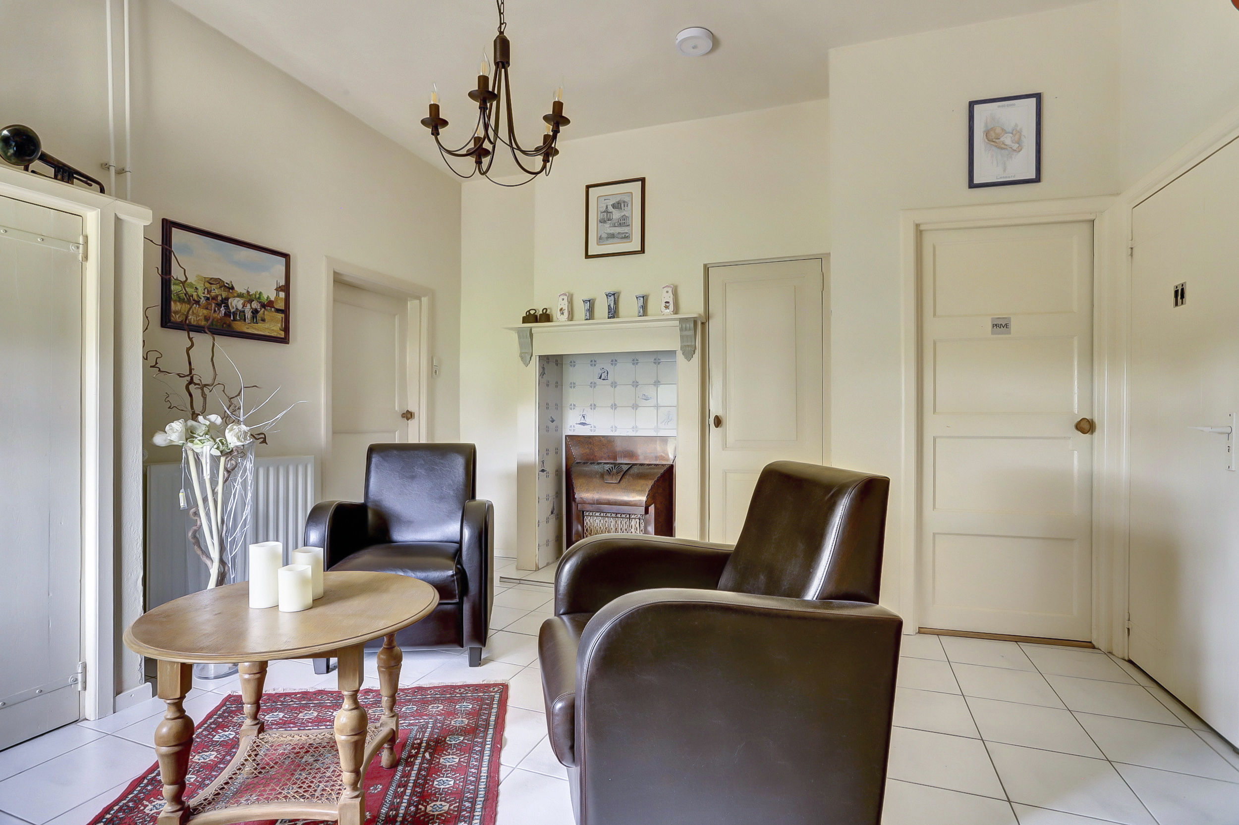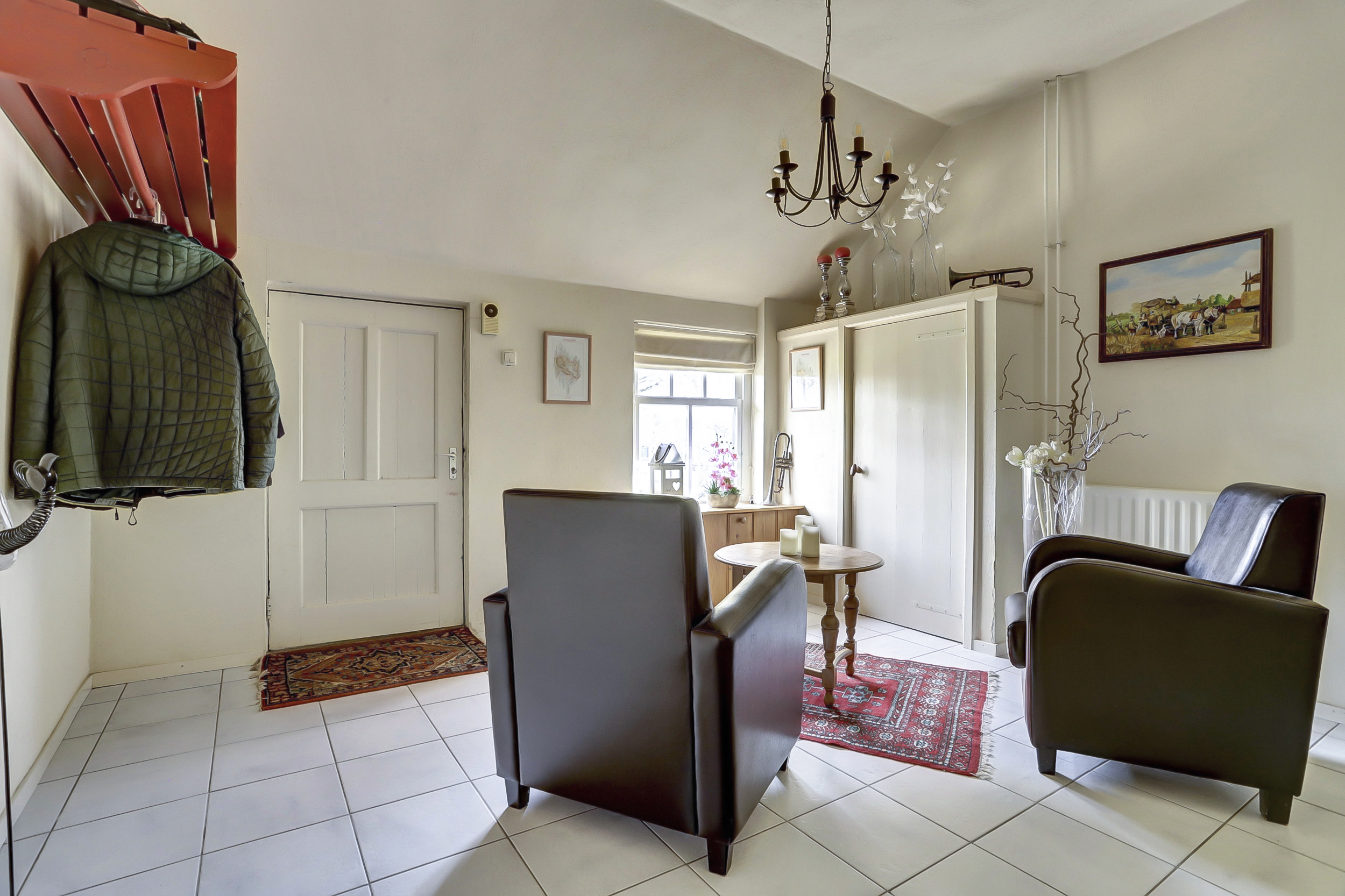Aan het einde van de gang ligt een zijentree, die ook uitstekend dienst kan doen als werkkamer. Via deze ruimte heb je toegang tot de kelder en de met haag en diverse beplantingen omzoomde oprit.