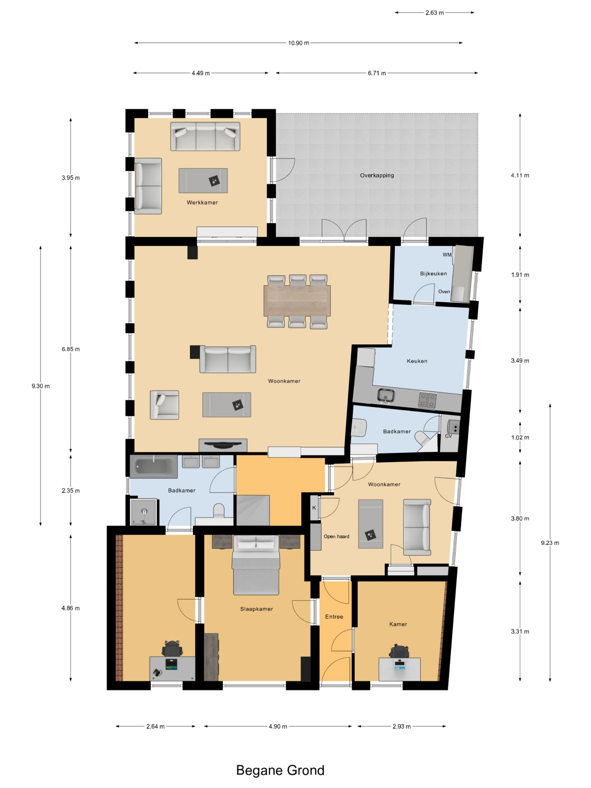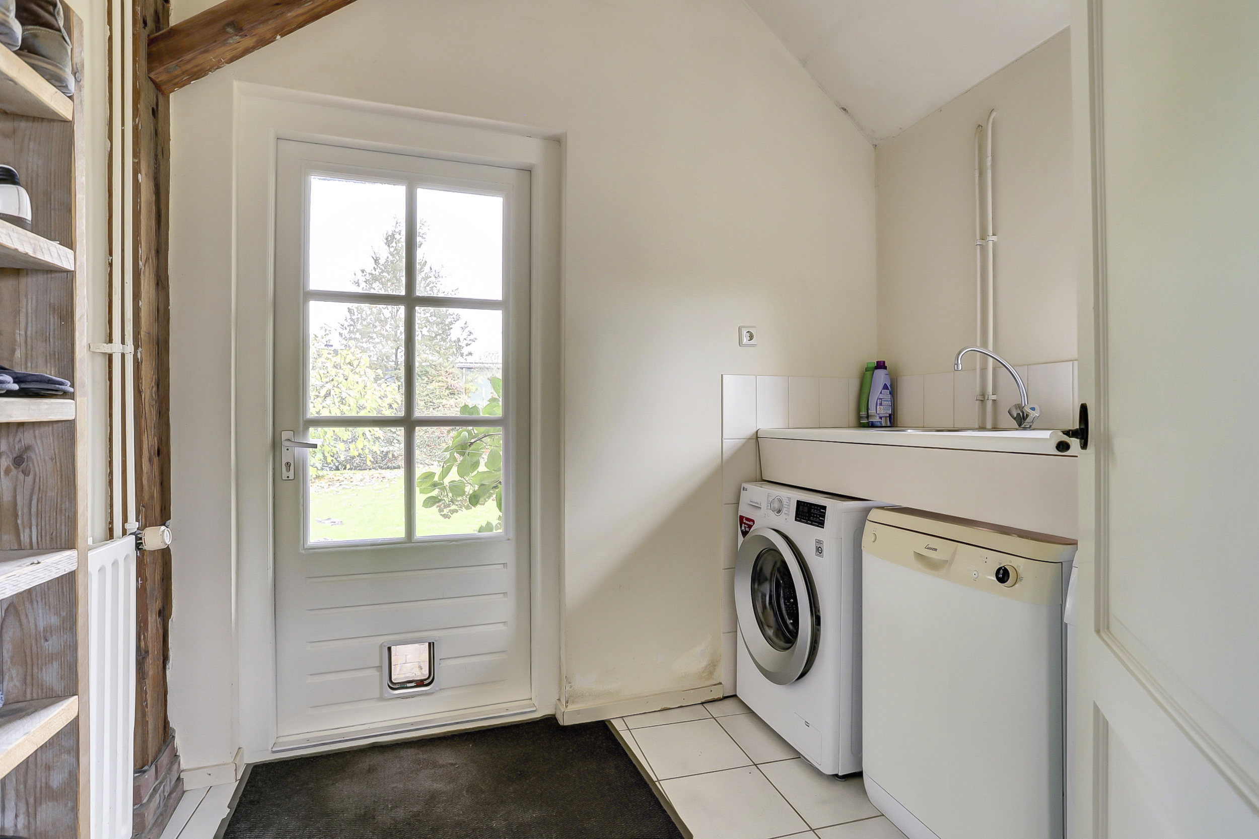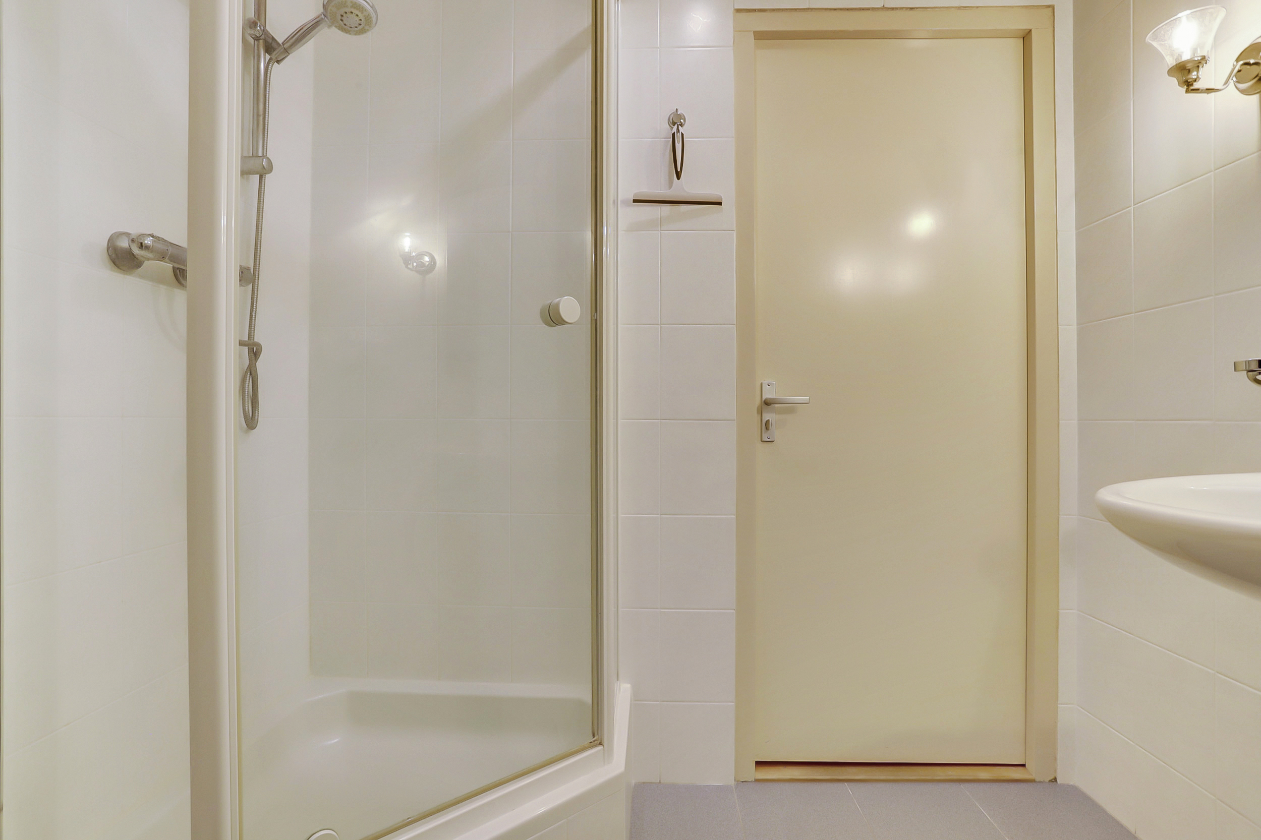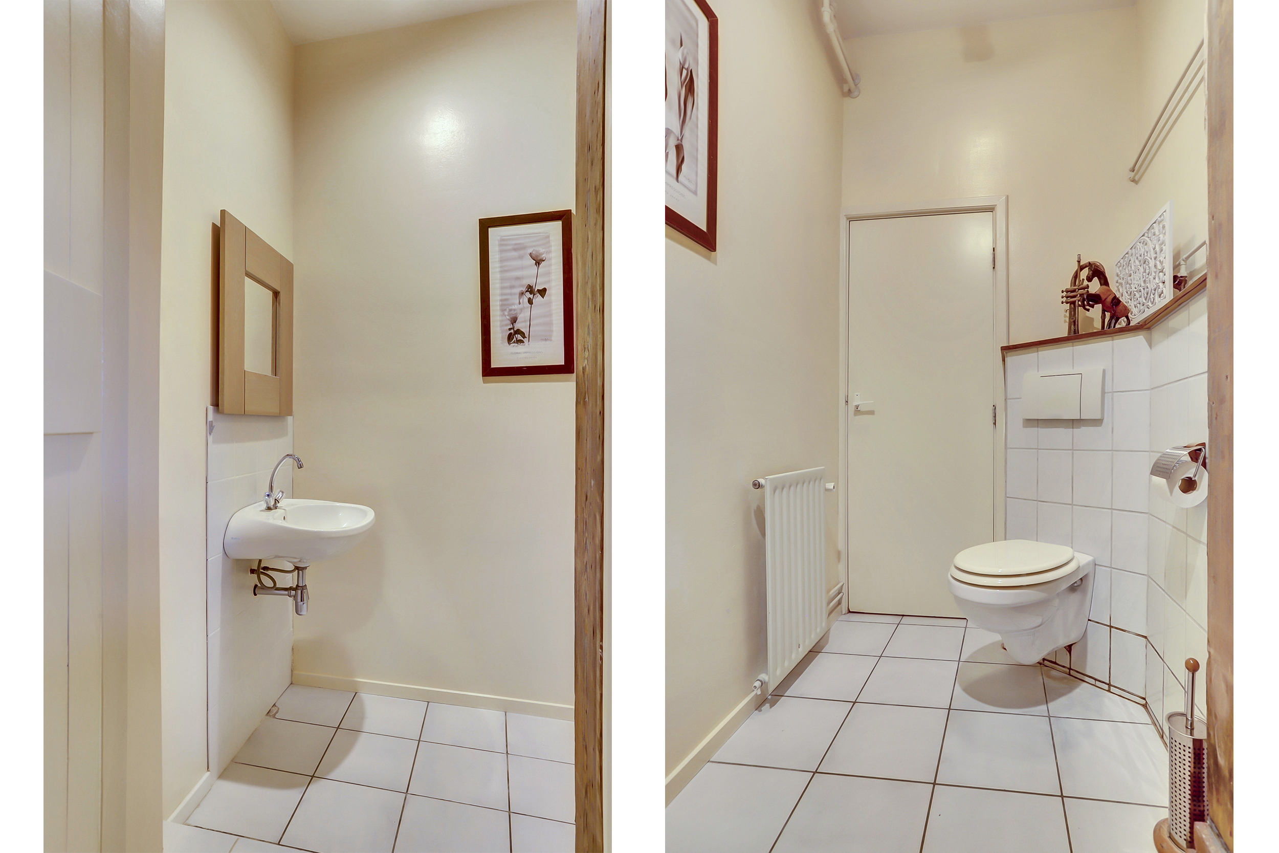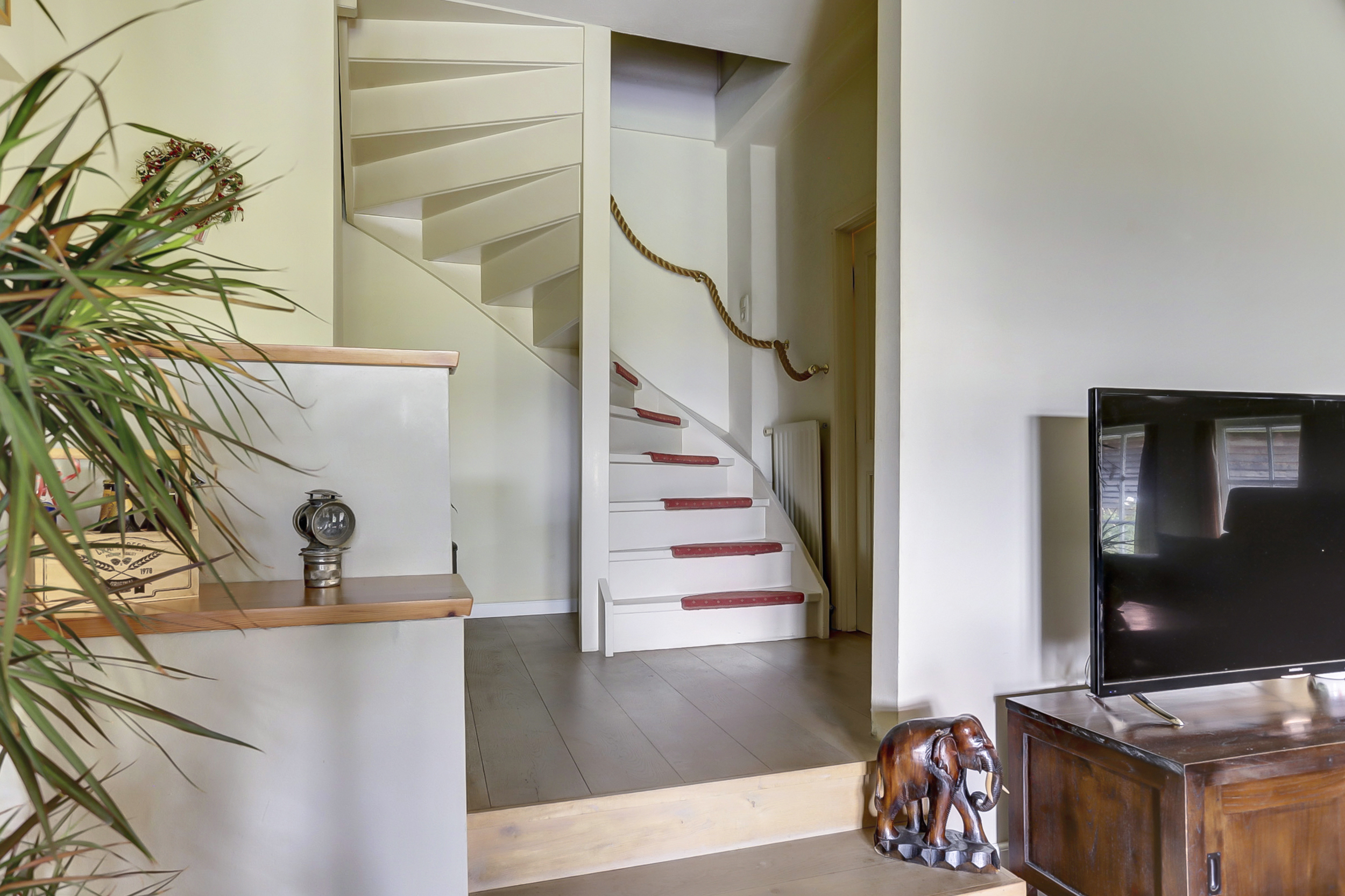 Aan het einde van de gang ligt een zijentree, die ook uitstekend dienst kan doen als werkkamer. Via deze ruimte heb je toegang tot de kelder en de met haag en diverse beplantingen omzoomde oprit.