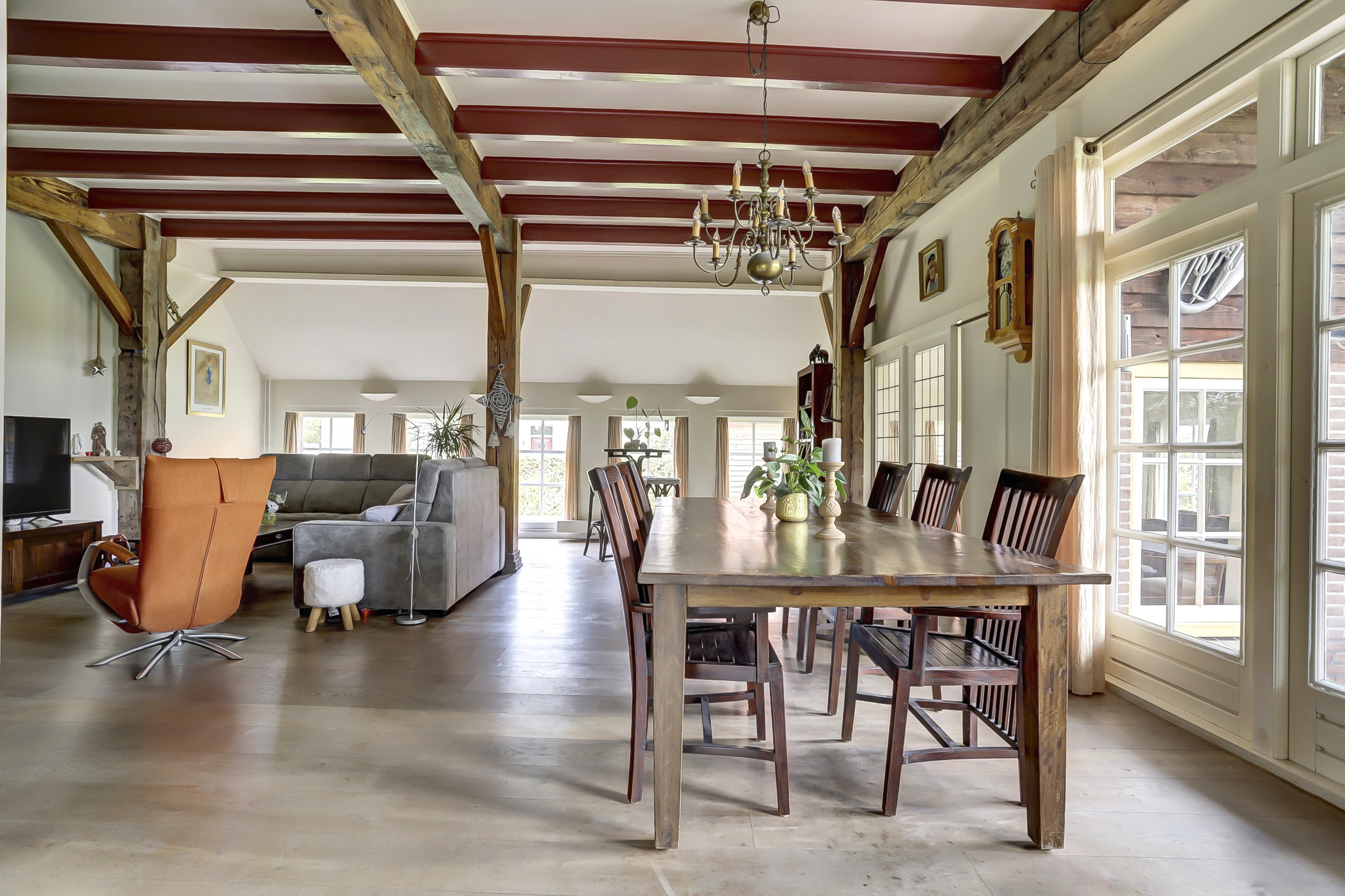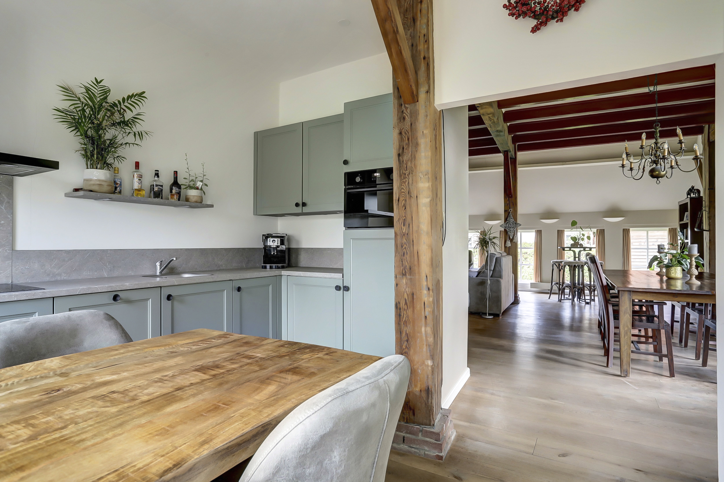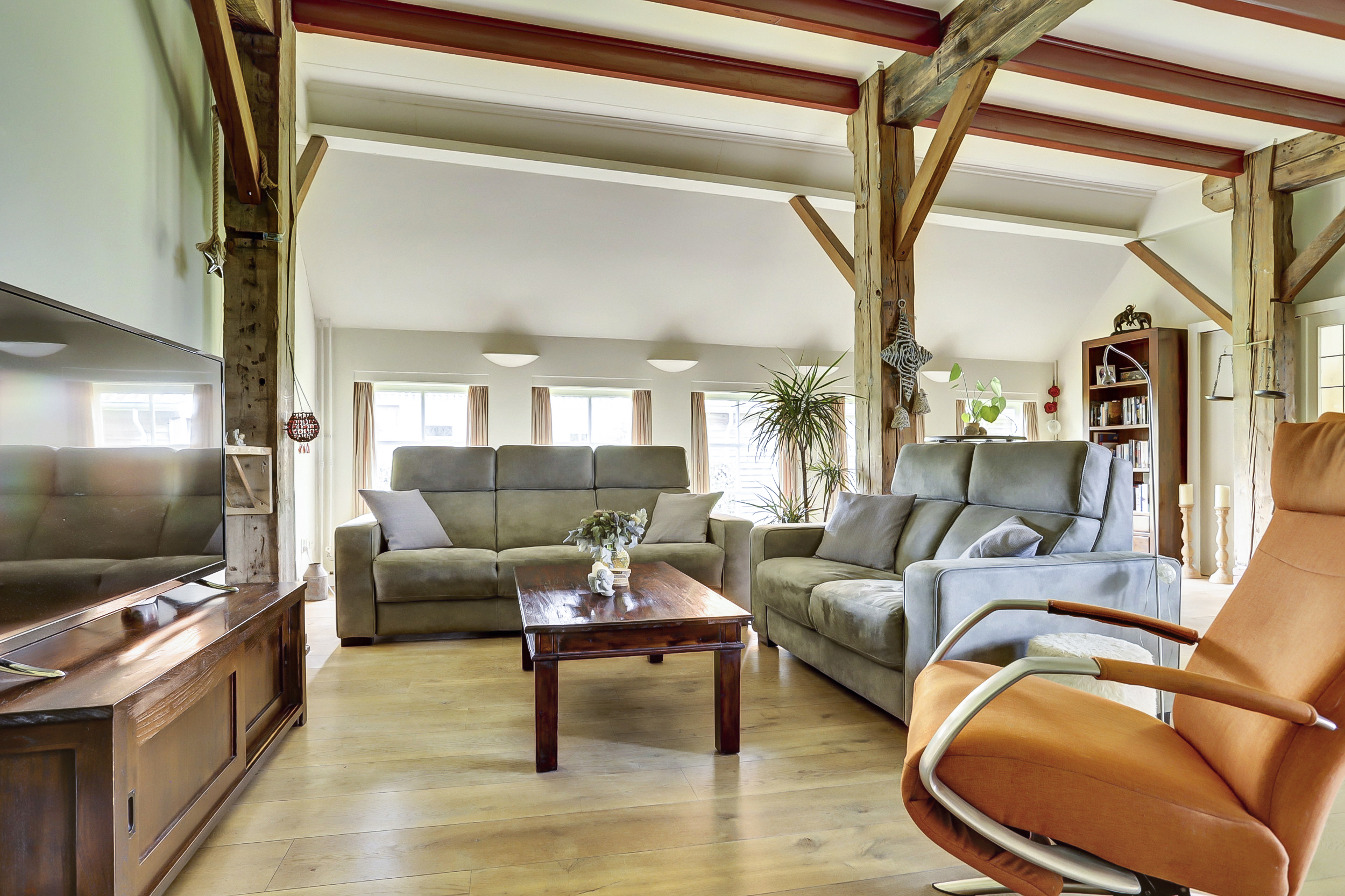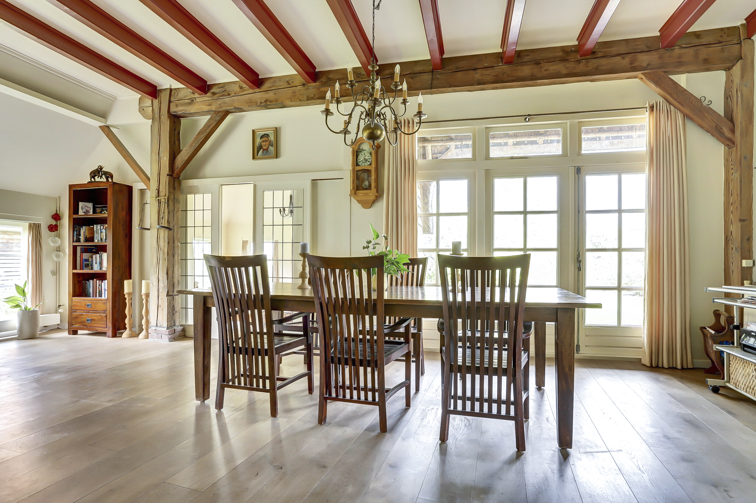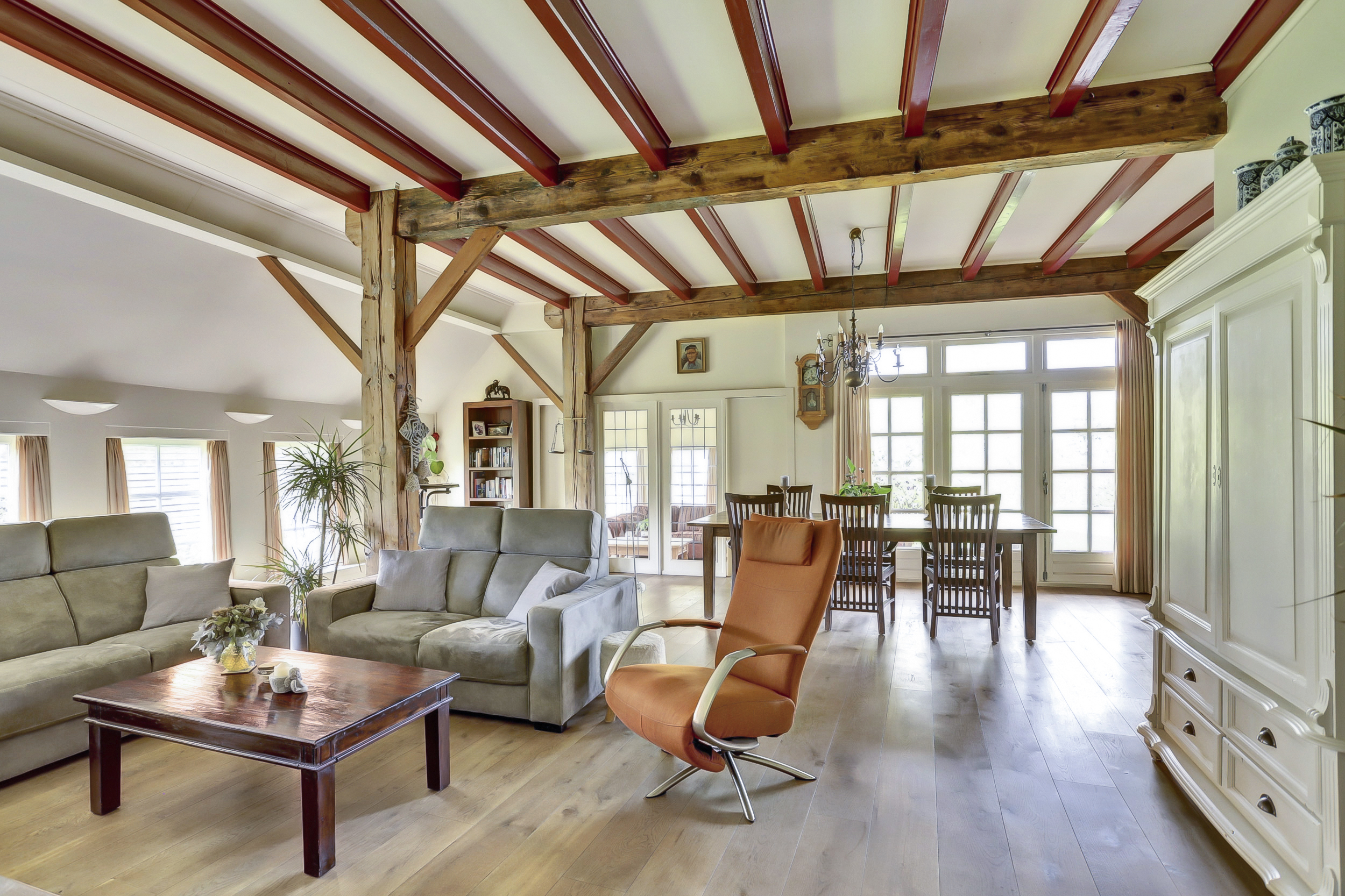 De rustieke eikenhoutenvloer in woonkamer en keuken zijn voorzien van vloerverwarming en vanuit de woonkamer het fraaie terras onder een gelderse overstek gelegen.
