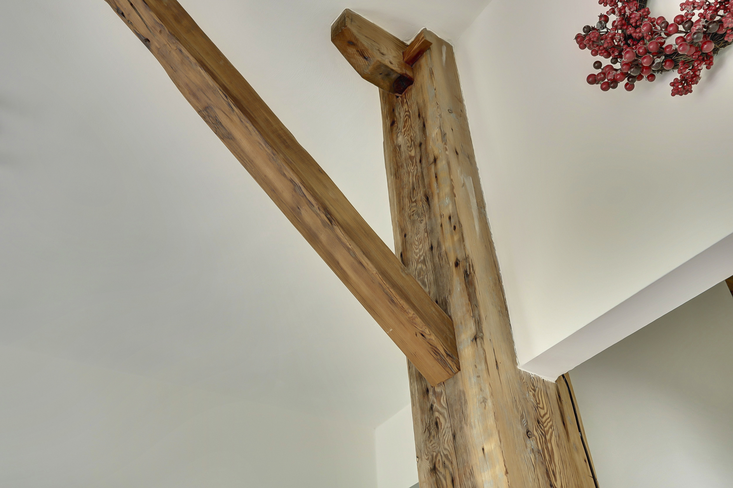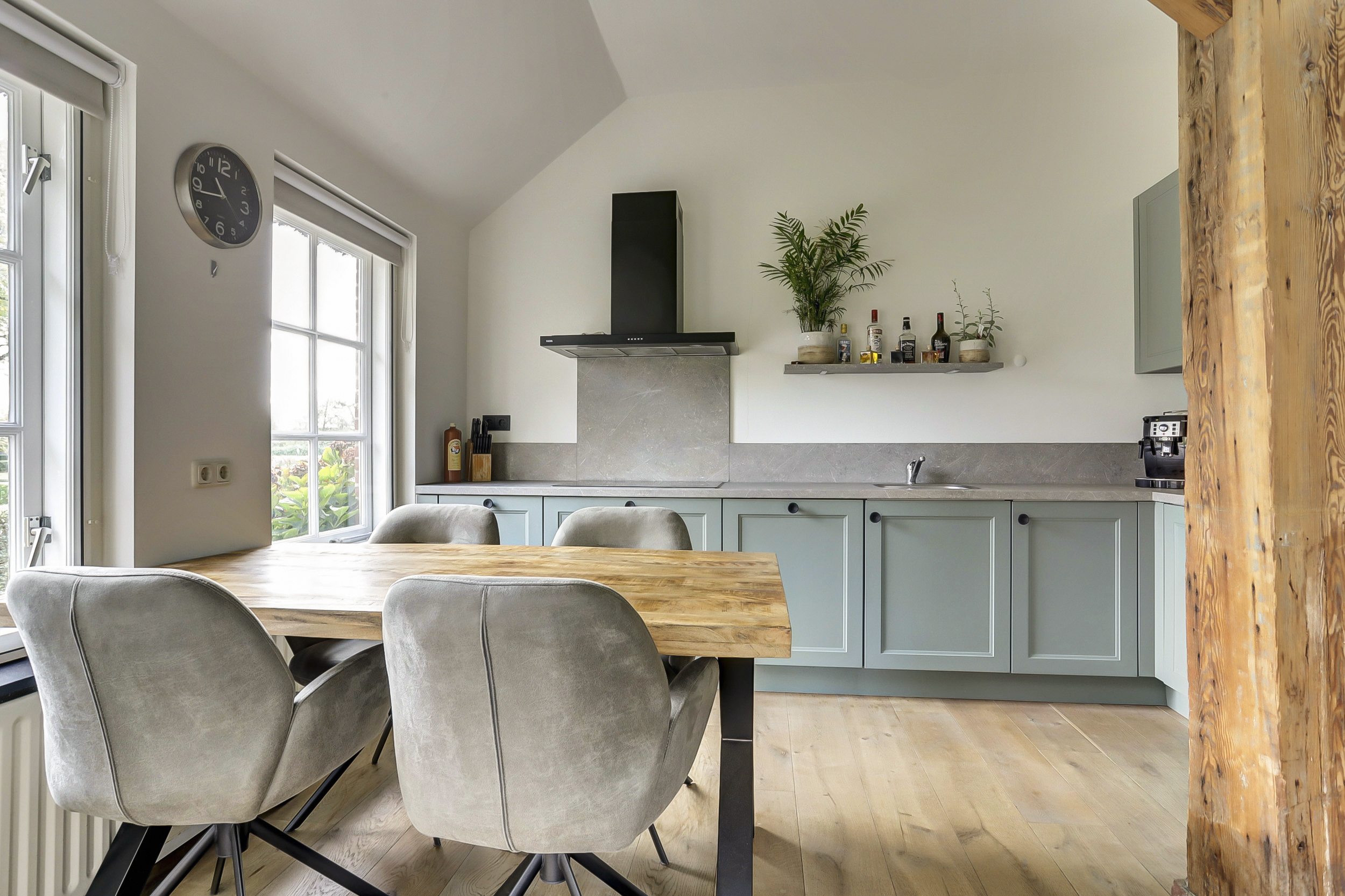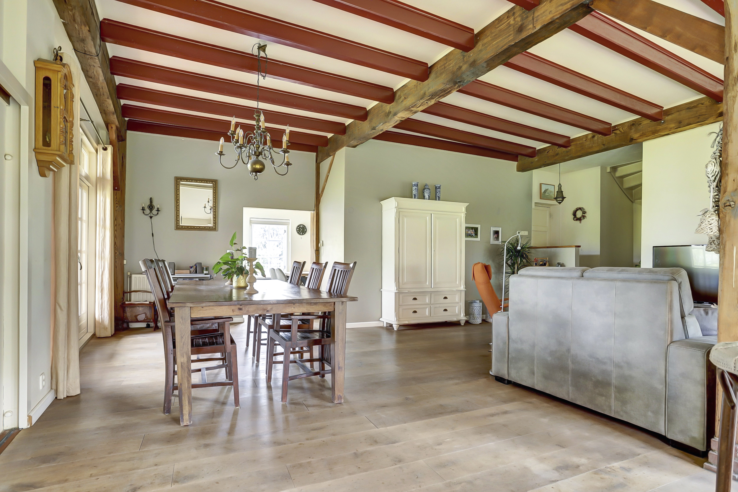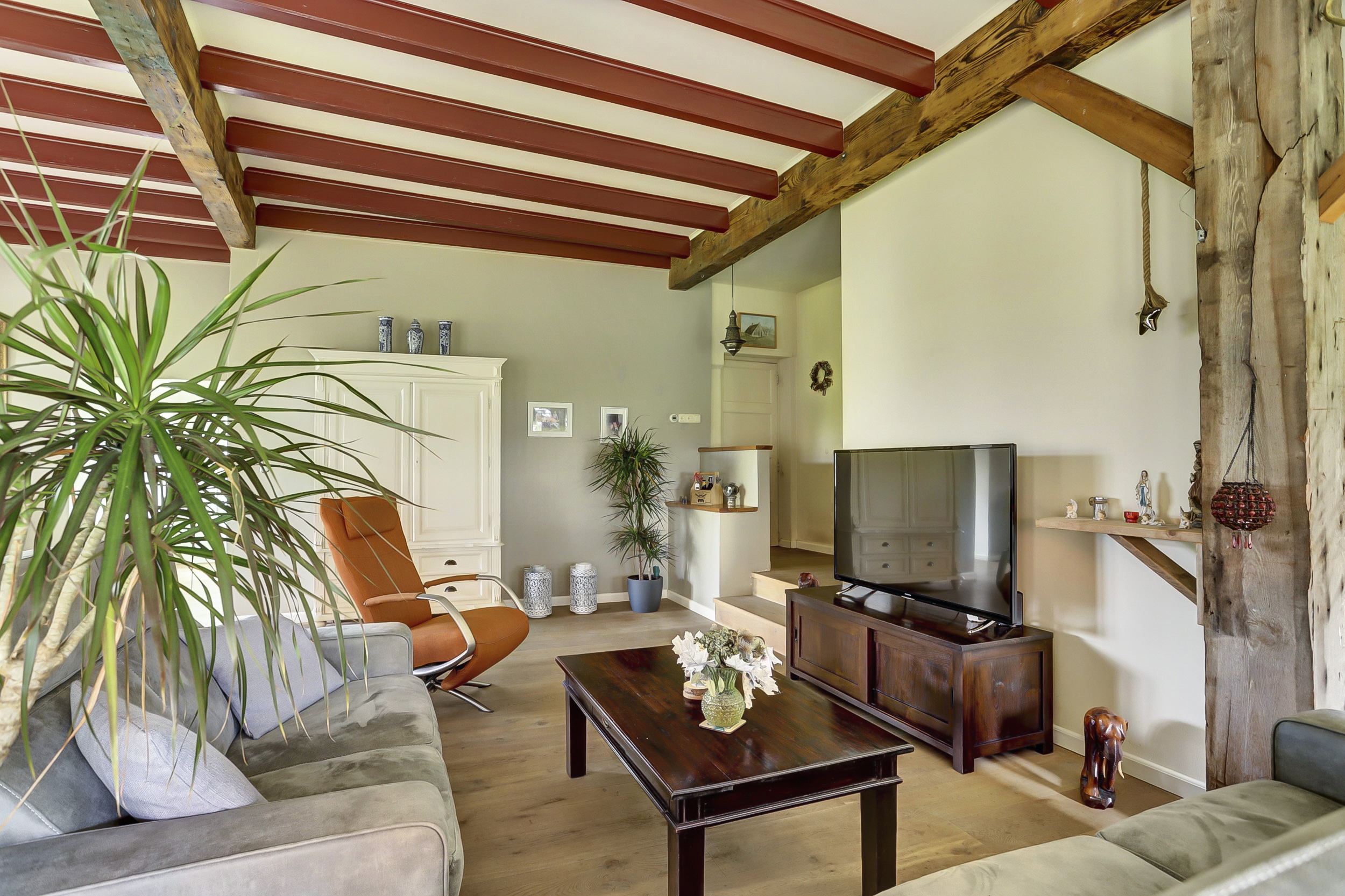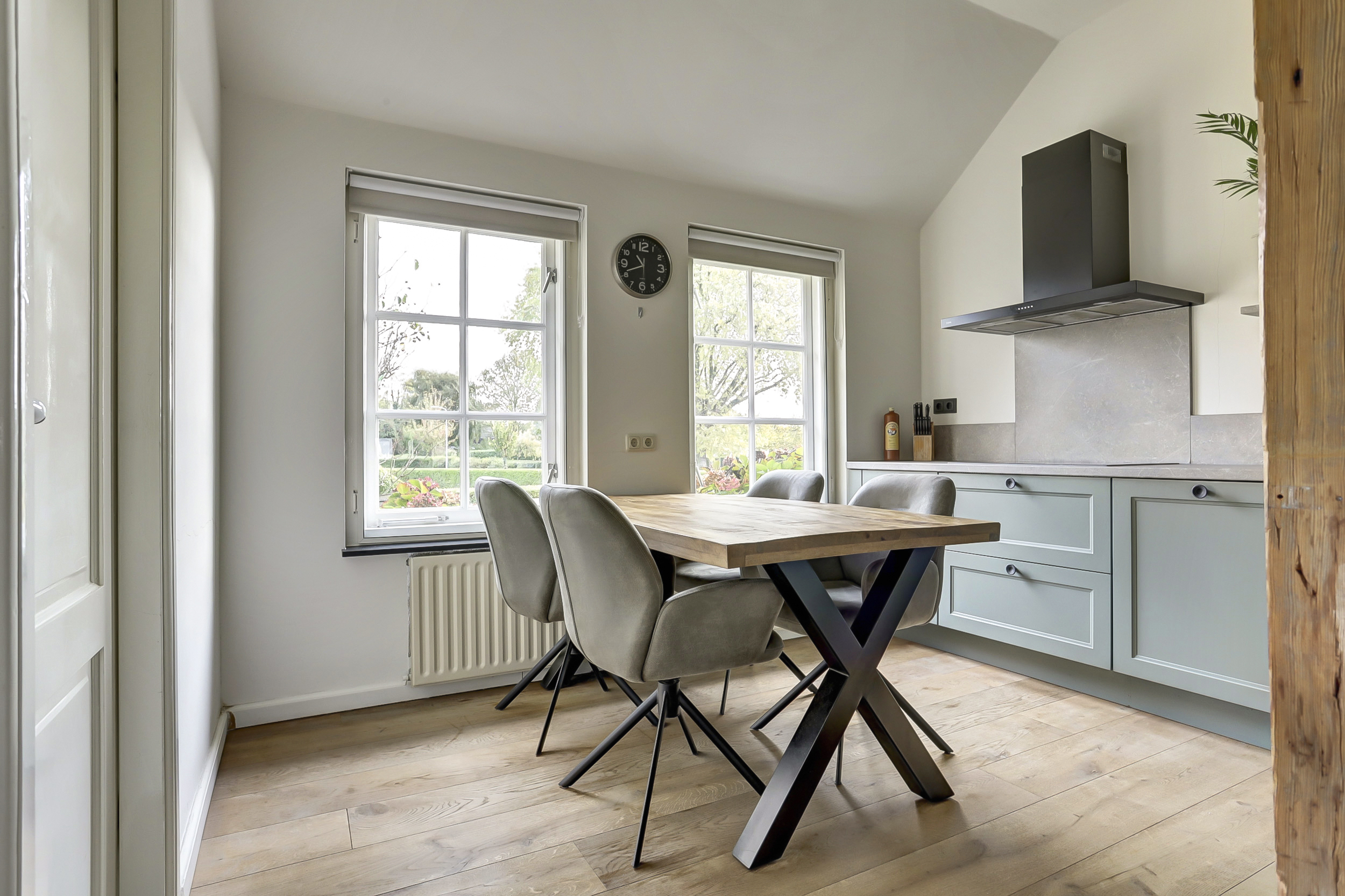 De rustieke eikenhoutenvloer in woonkamer en keuken zijn voorzien van vloerverwarming en vanuit de woonkamer het fraaie terras onder een gelderse overstek gelegen.