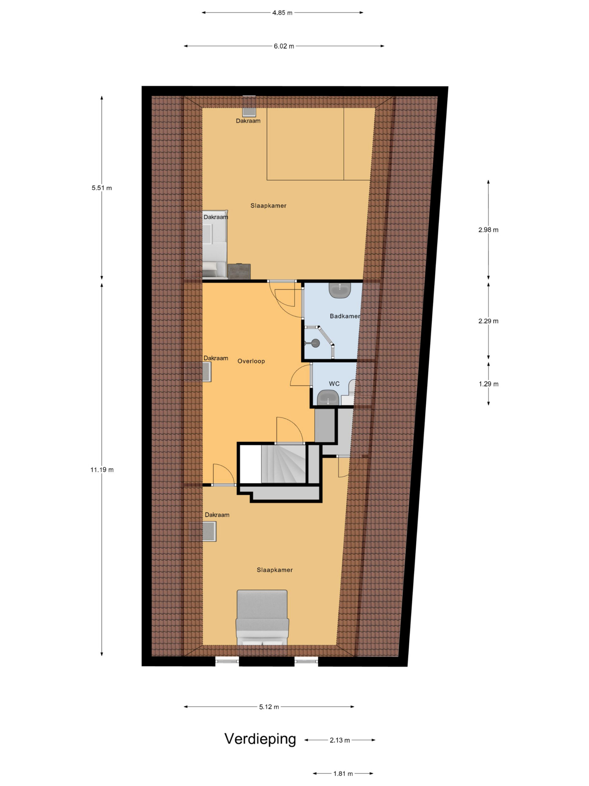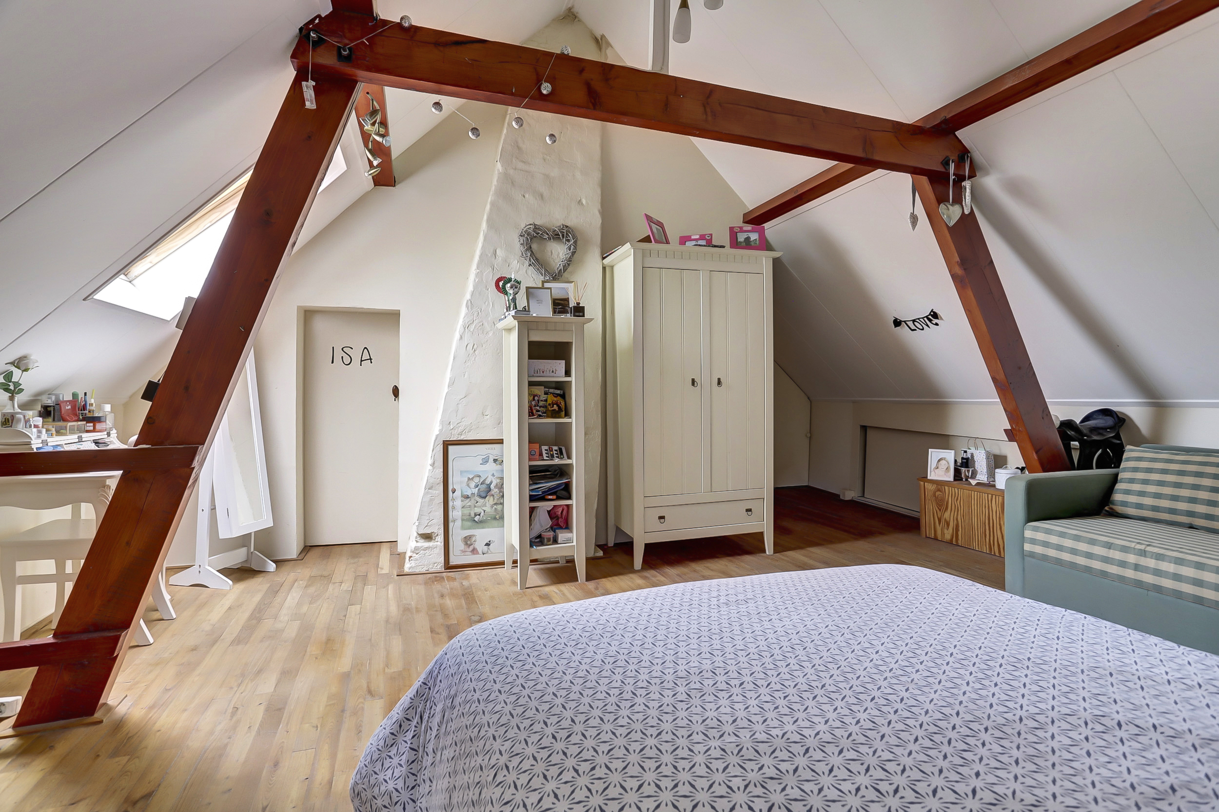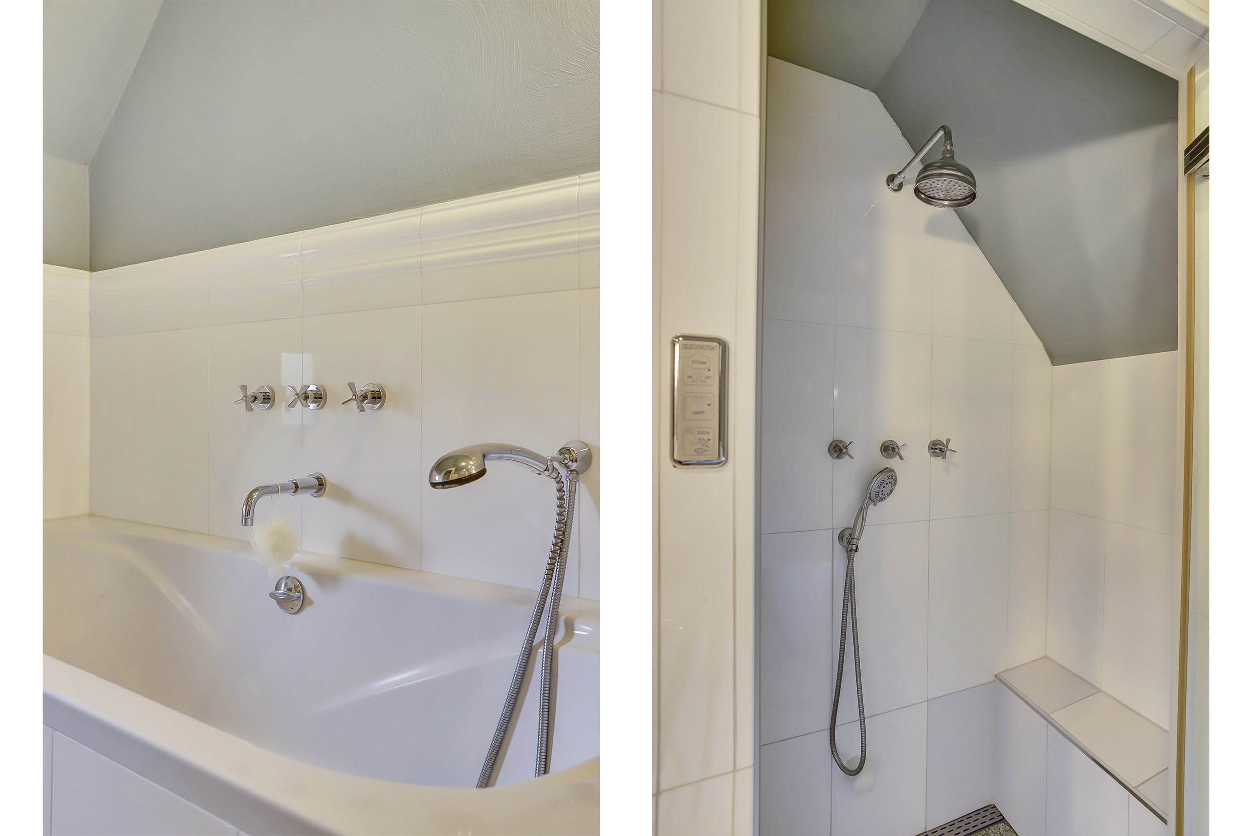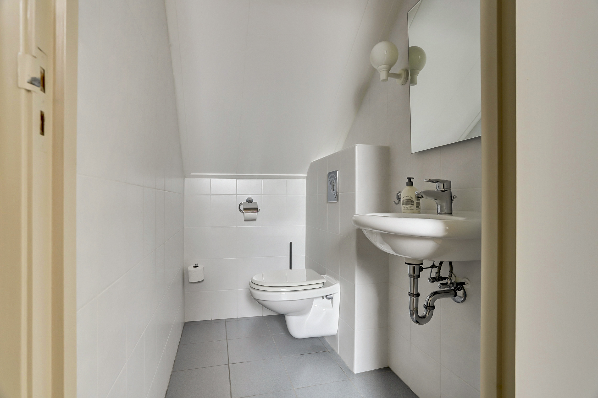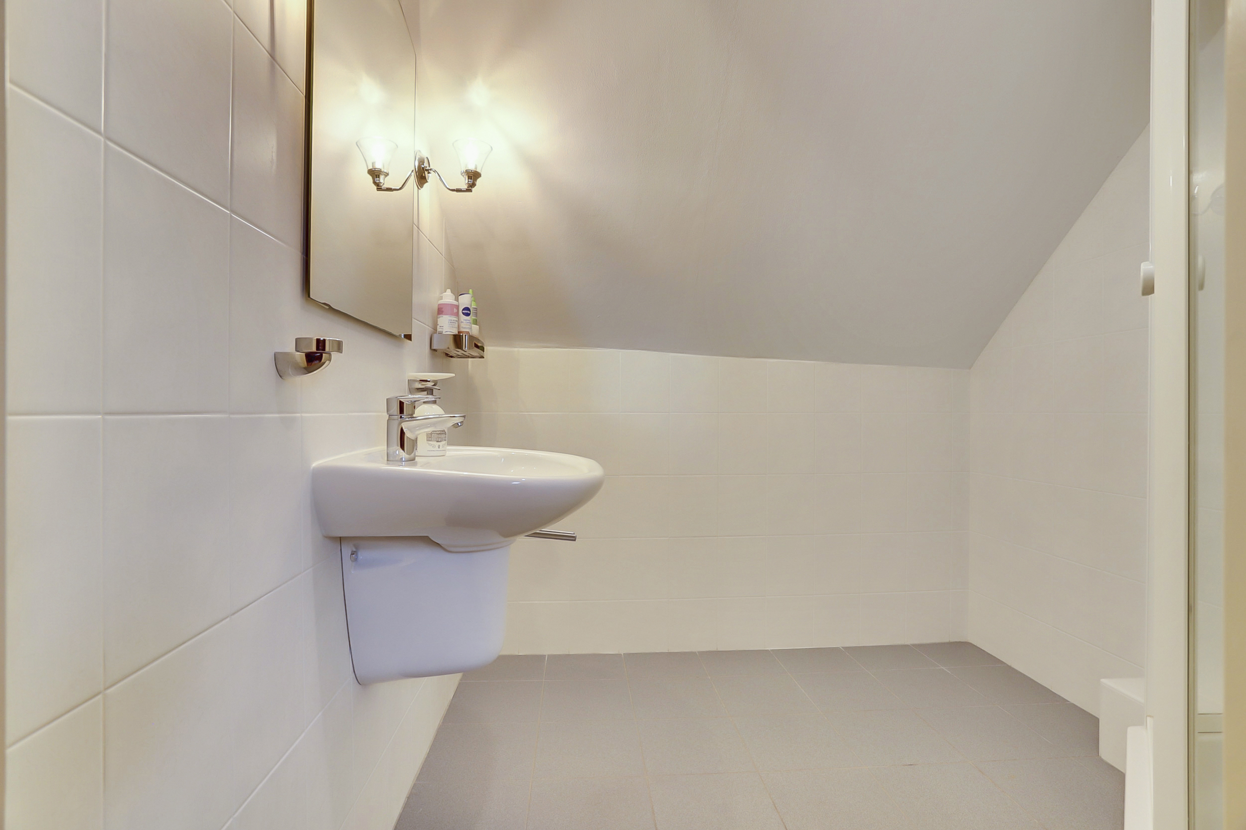 Een vaste trap leidt naar de eerste verdieping met een royale overloop onder de hoge kap welke toegang verschaft aan de divesre vertrekken. Aan de voorzijde en achterzijde liggen twee ruime slaapkamers met veel lichtinval dankzij de lage roederamen en dakvensters. De tweede badkamer beschikt over een douche en wastafel; daarnaast is er een separaat toilet. De gehele verdieping is afgewerkt met stucwerk en beuken vloerdelen.