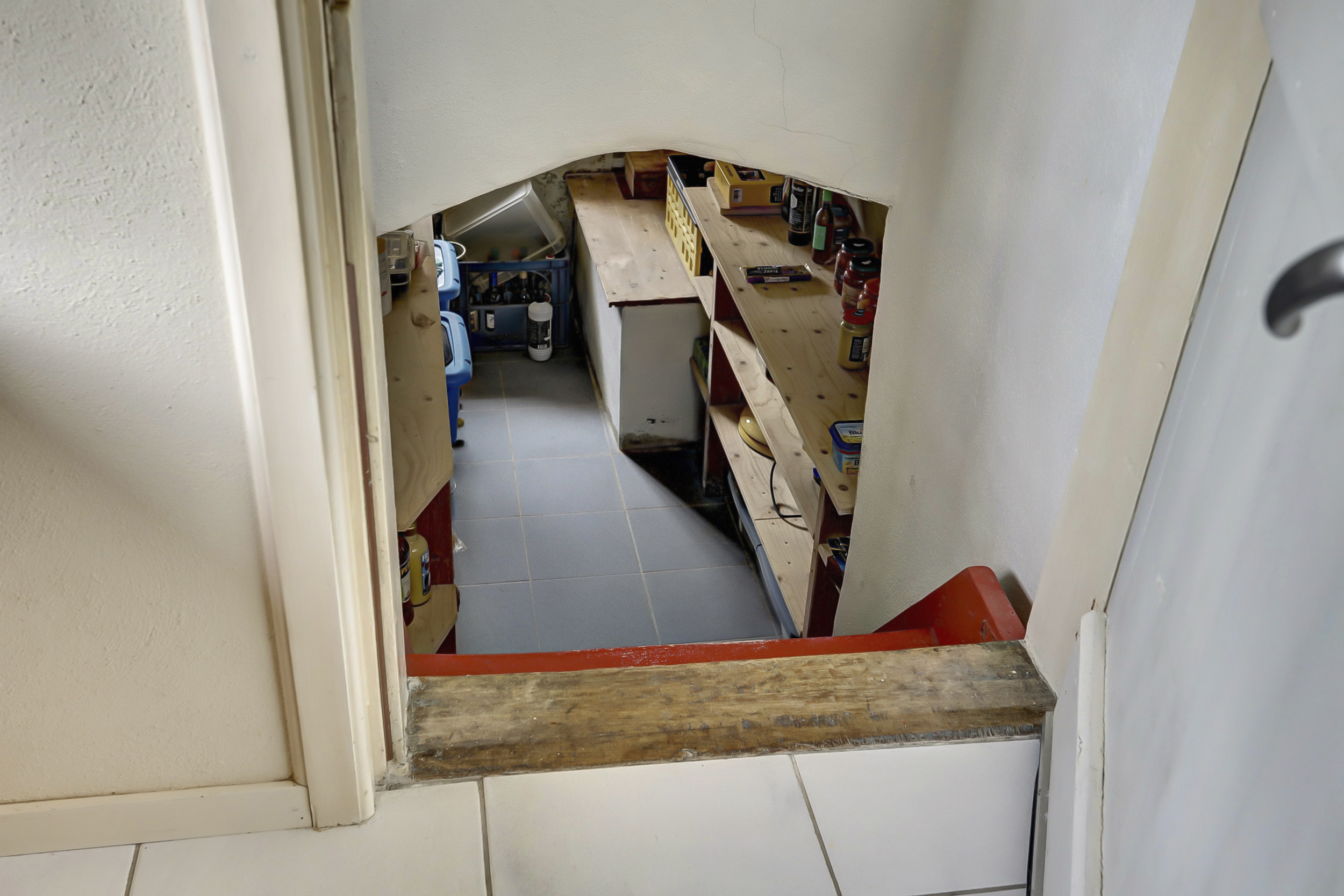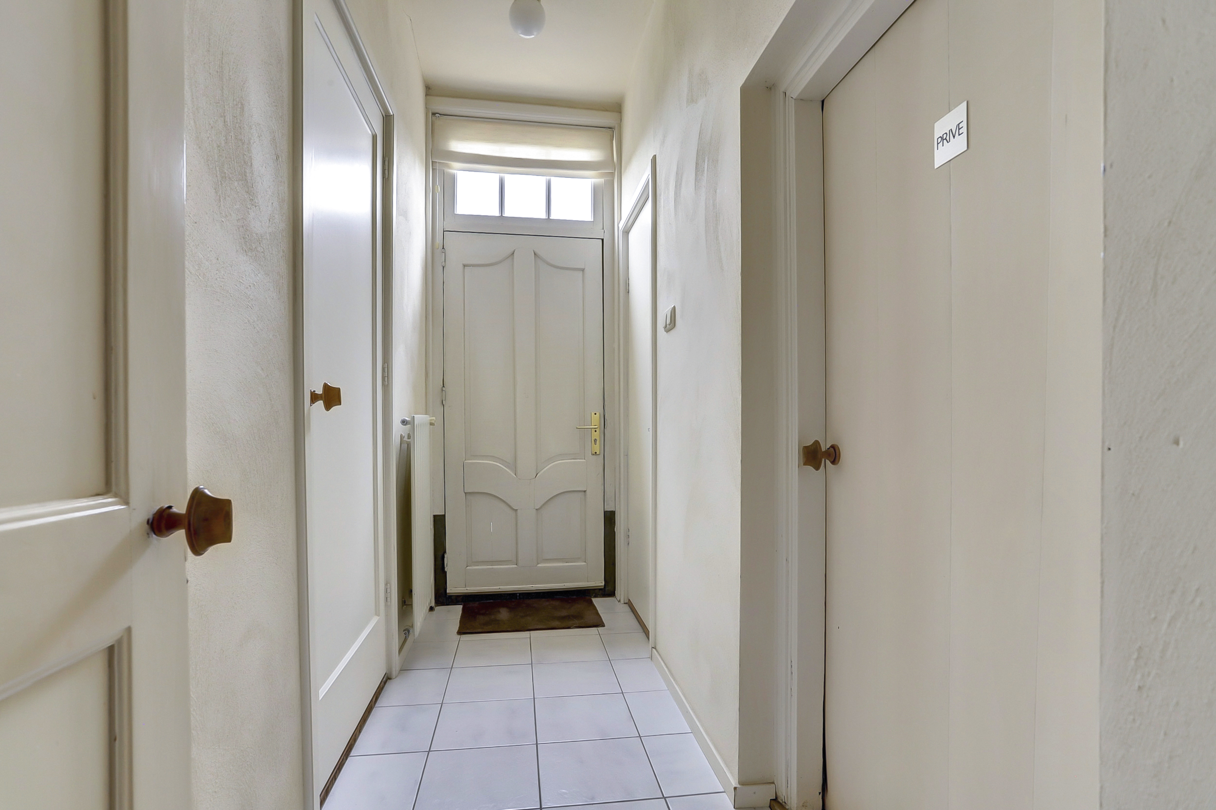 Via een hardstenen trap met vier treden bereik je de voordeur met bovenlicht. Achter de entree bevindt zich de gang met aan de rechterzijde de opkamer boven de kelder, ideaal als werkkamer of hobbyruimte.