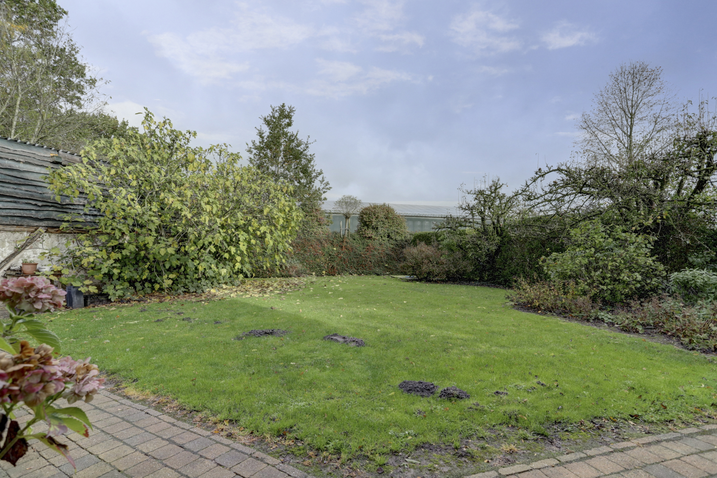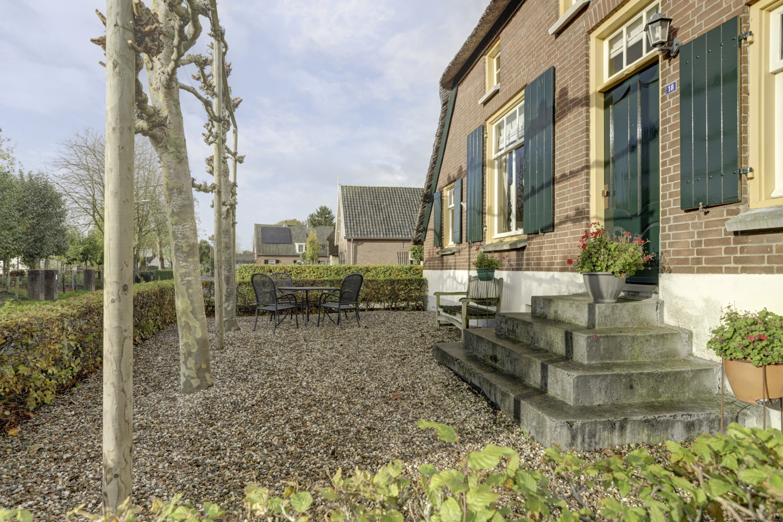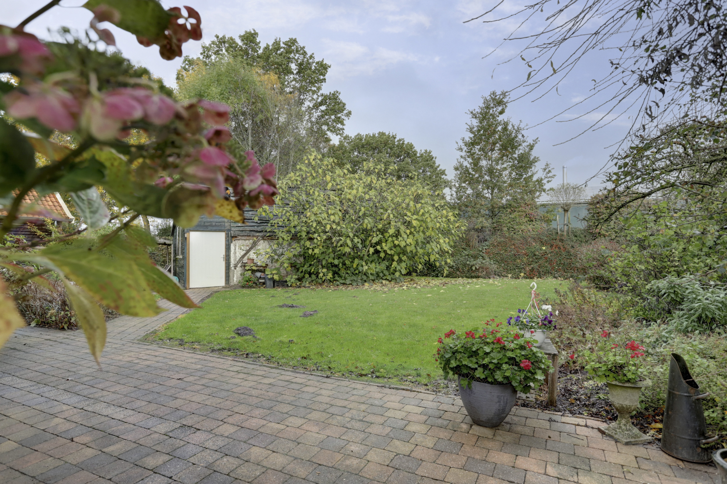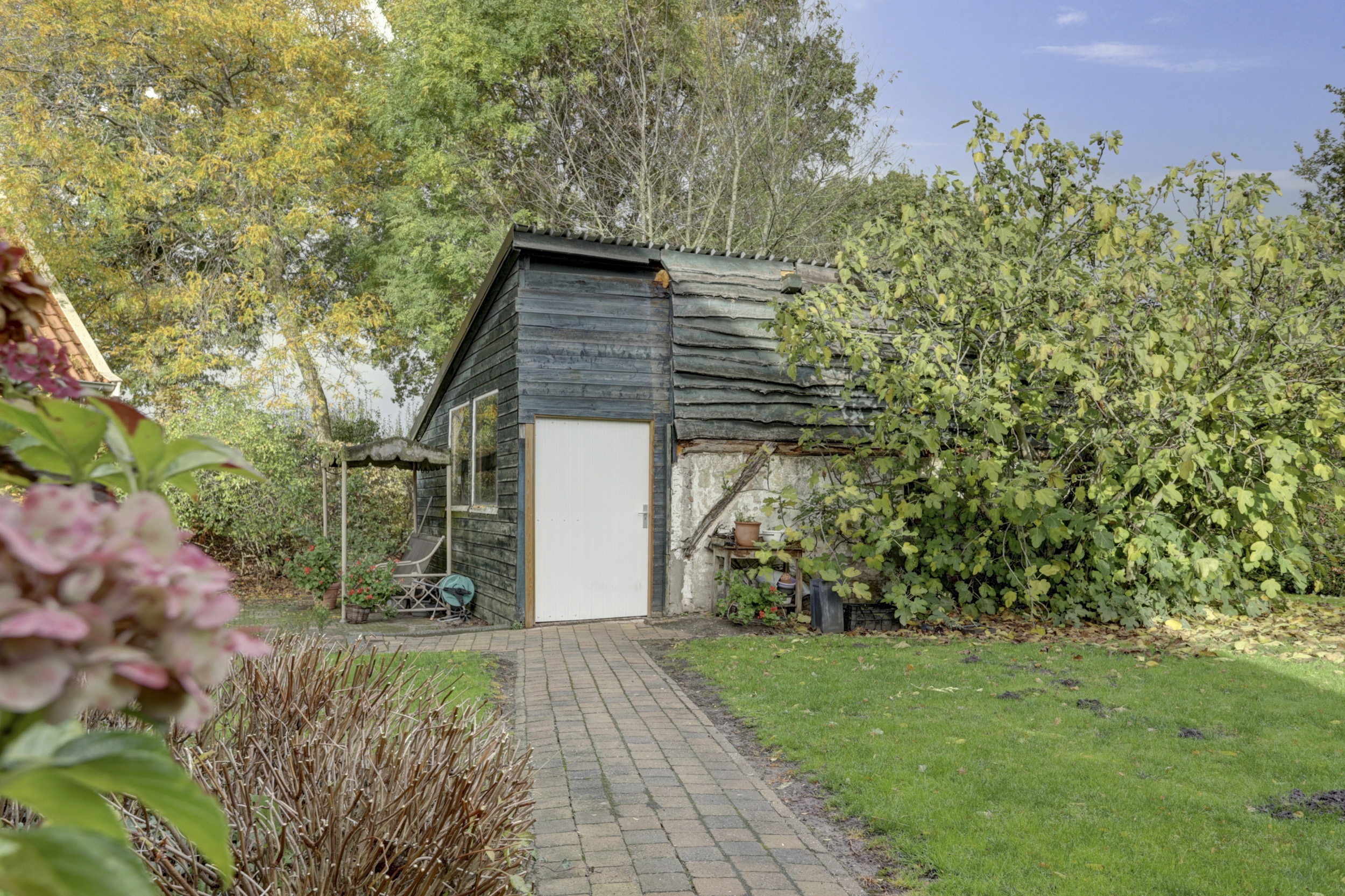 De riant aangelegde tuin met gazon, hortensia’s, lavendel, Buxusvakken en witte rozen is een lust voor het oog. Er zijn meerdere terrassen en volop parkeergelegenheid op eigen terrein. Achter op het perceel staat een schuur van 48 m², een overblijfsel van de vroegere hooiberg — eenvoudig van uitvoering maar met veel mogelijkheden. De tuin wordt aan de achterzijde begrensd door een aardenwal, waardoor je volop privacy geniet.