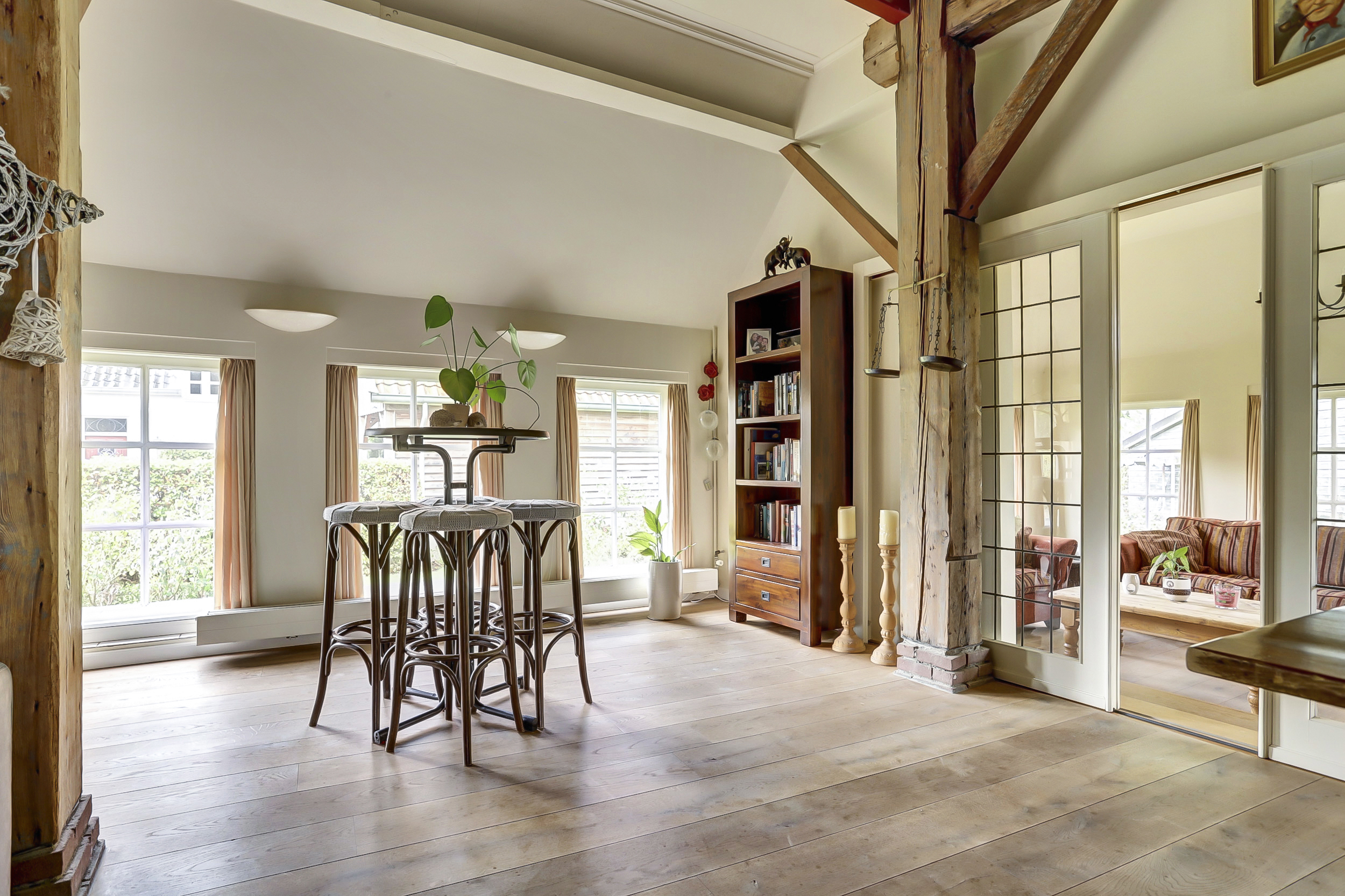 Aan de achterzijde van de woning bevindt zich de lichte tuingerichte leefruimte van maar liefst 77 m², bestaande uit een woonkamer (60 m²) en een tuinkamer (17 m²). Dankzij de vele 6-ruitsramen, de hoge plafonds en de zichtbare gebinten ademt deze ruimte sfeer en karakter.