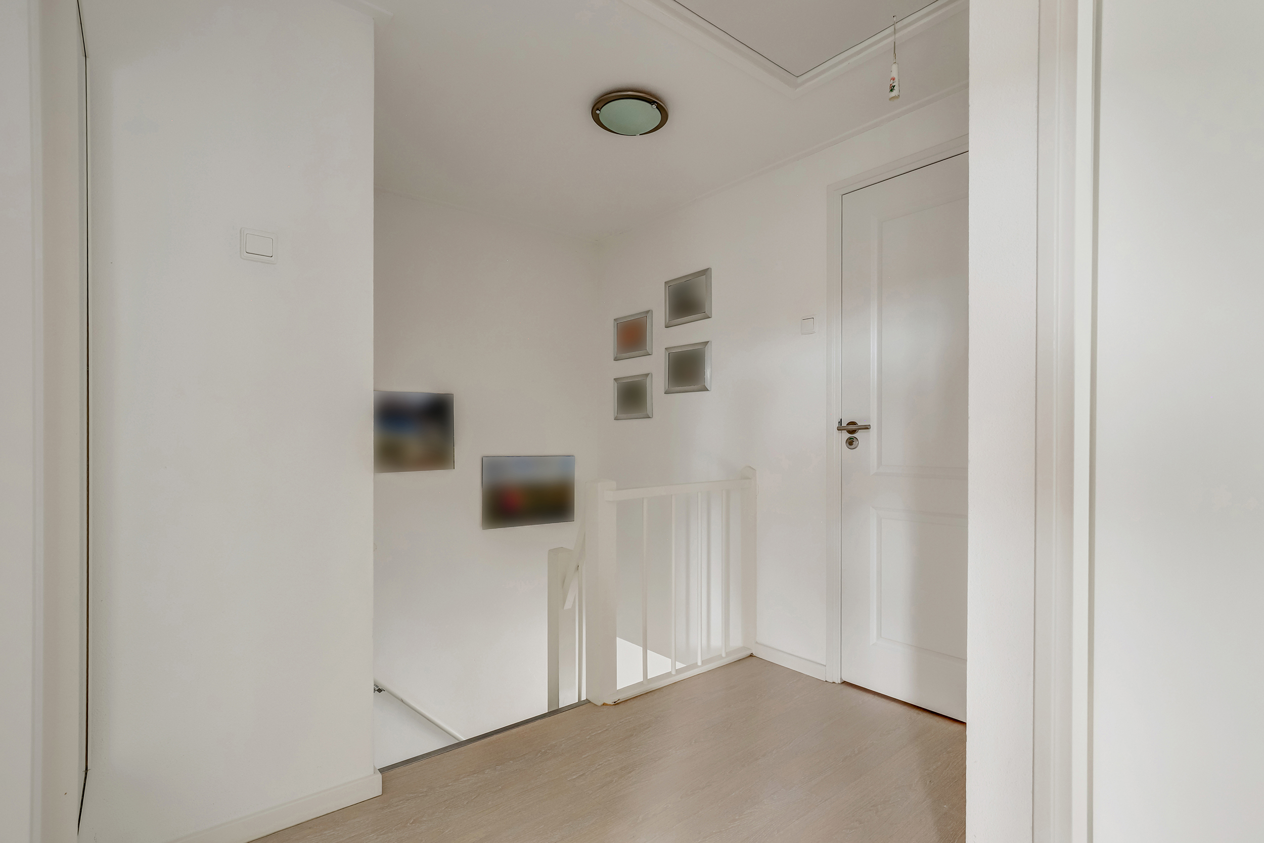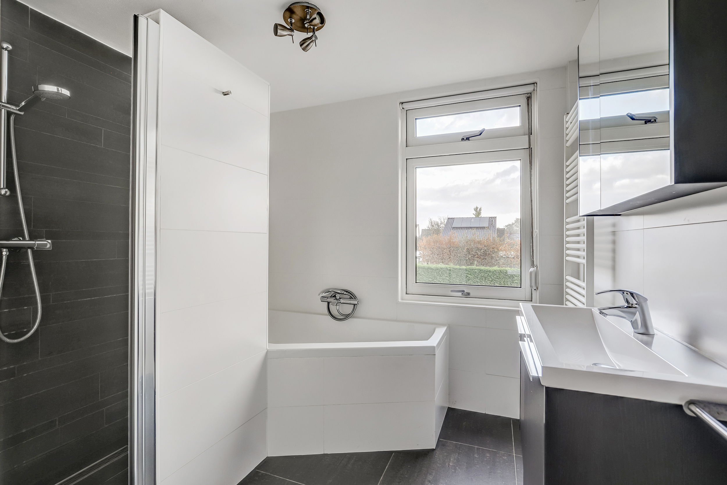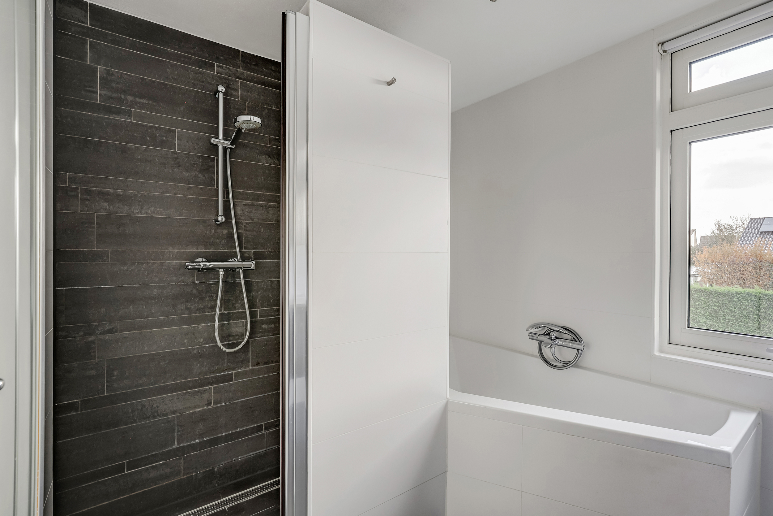 De vaste trap leidt naar een ruime overloop met toegang tot drie slaapkamers, waarvan één aan de voorzijde en twee aan de achterzijde. De badkamer is modern uitgevoerd en beschikt over een ligbad, inloopdouche, wastafelmeubel en toilet. Daarnaast is er een praktische aparte ruimte voor een wasmachine- en drogeraansluiting.