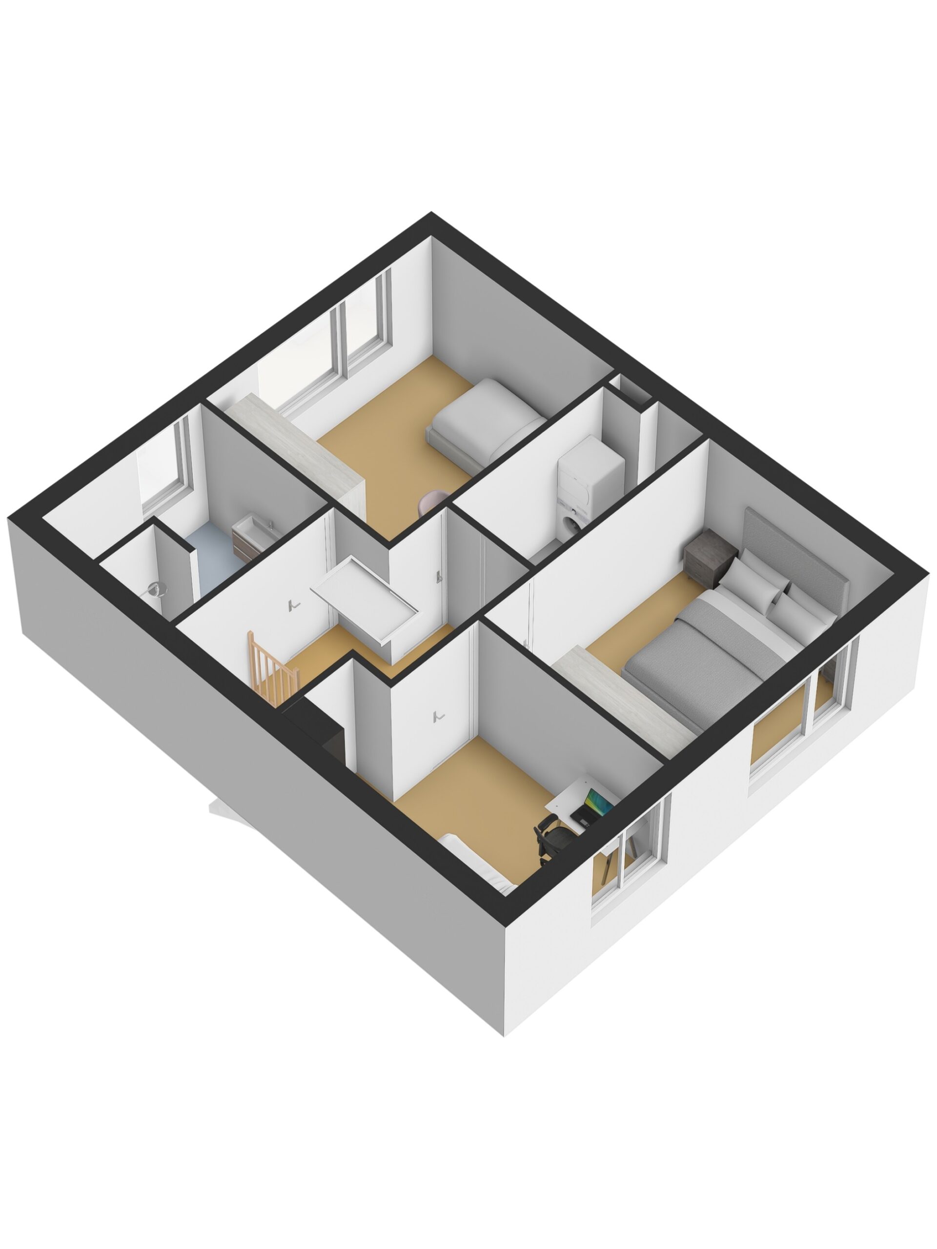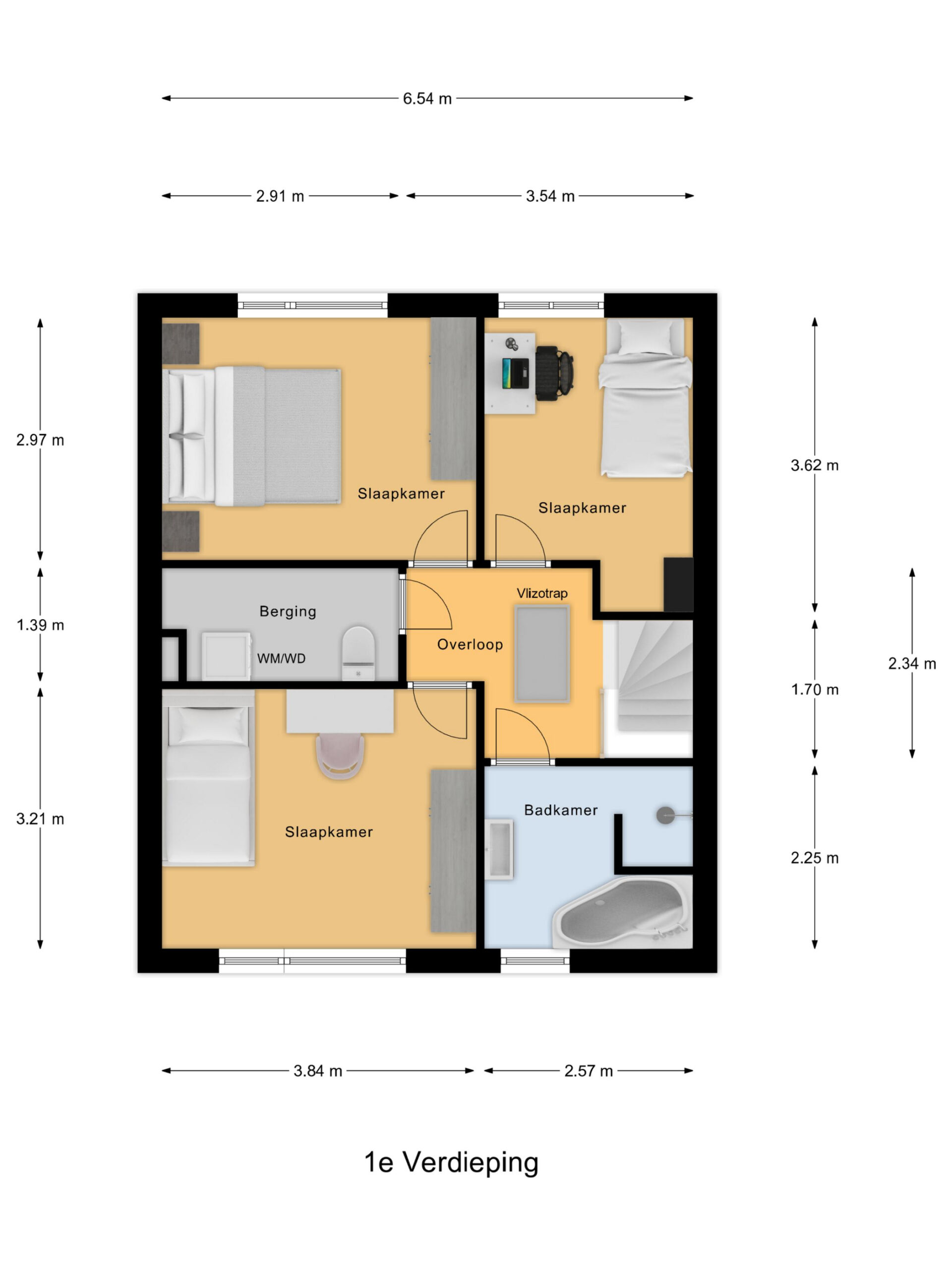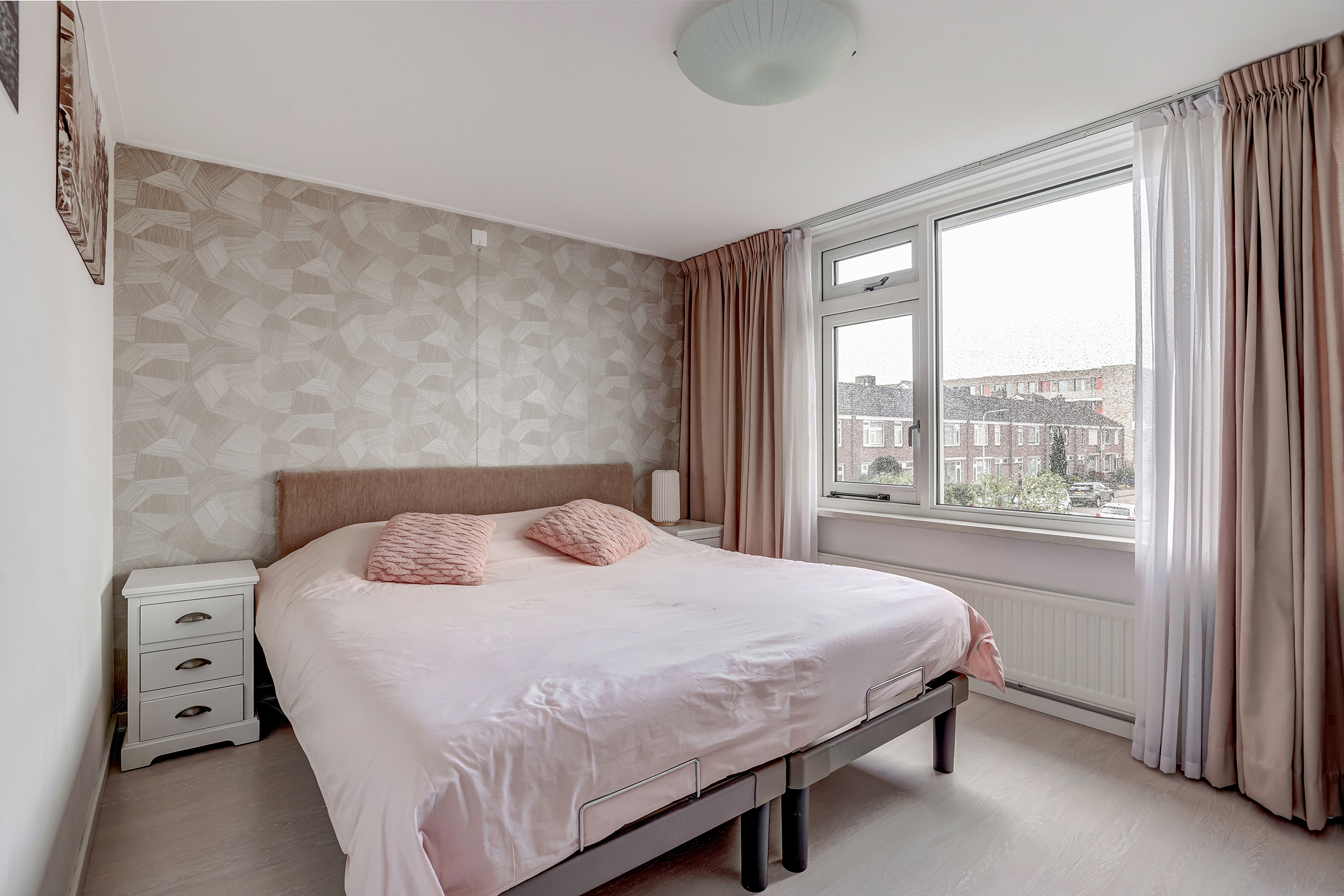 De vaste trap leidt naar een ruime overloop met toegang tot drie slaapkamers, waarvan één aan de voorzijde en twee aan de achterzijde. De badkamer is modern uitgevoerd en beschikt over een ligbad, inloopdouche, wastafelmeubel en toilet. Daarnaast is er een praktische aparte ruimte voor een wasmachine- en drogeraansluiting.