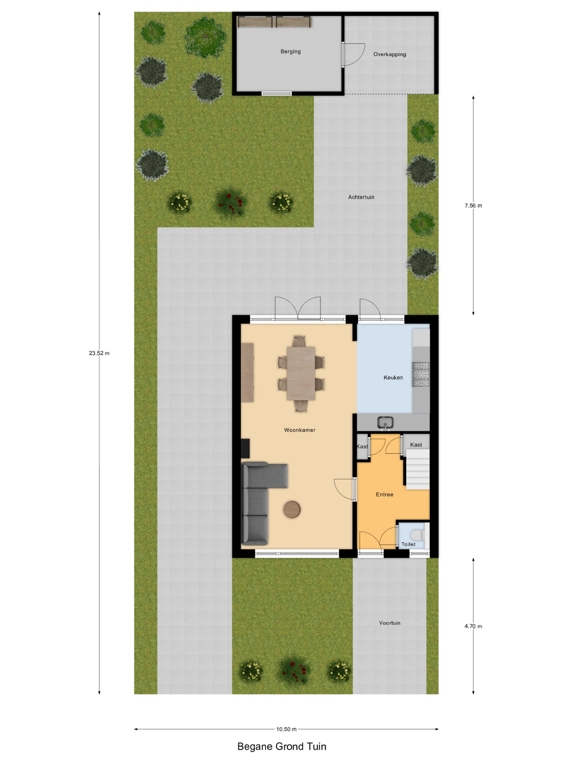 Verder beschikt de tuin over een net gazon, een vrijstaande berging en een dubbele poort, ideaal voor het eenvoudig stallen van bijvoorbeeld motoren, een aanhanger of fietsen.