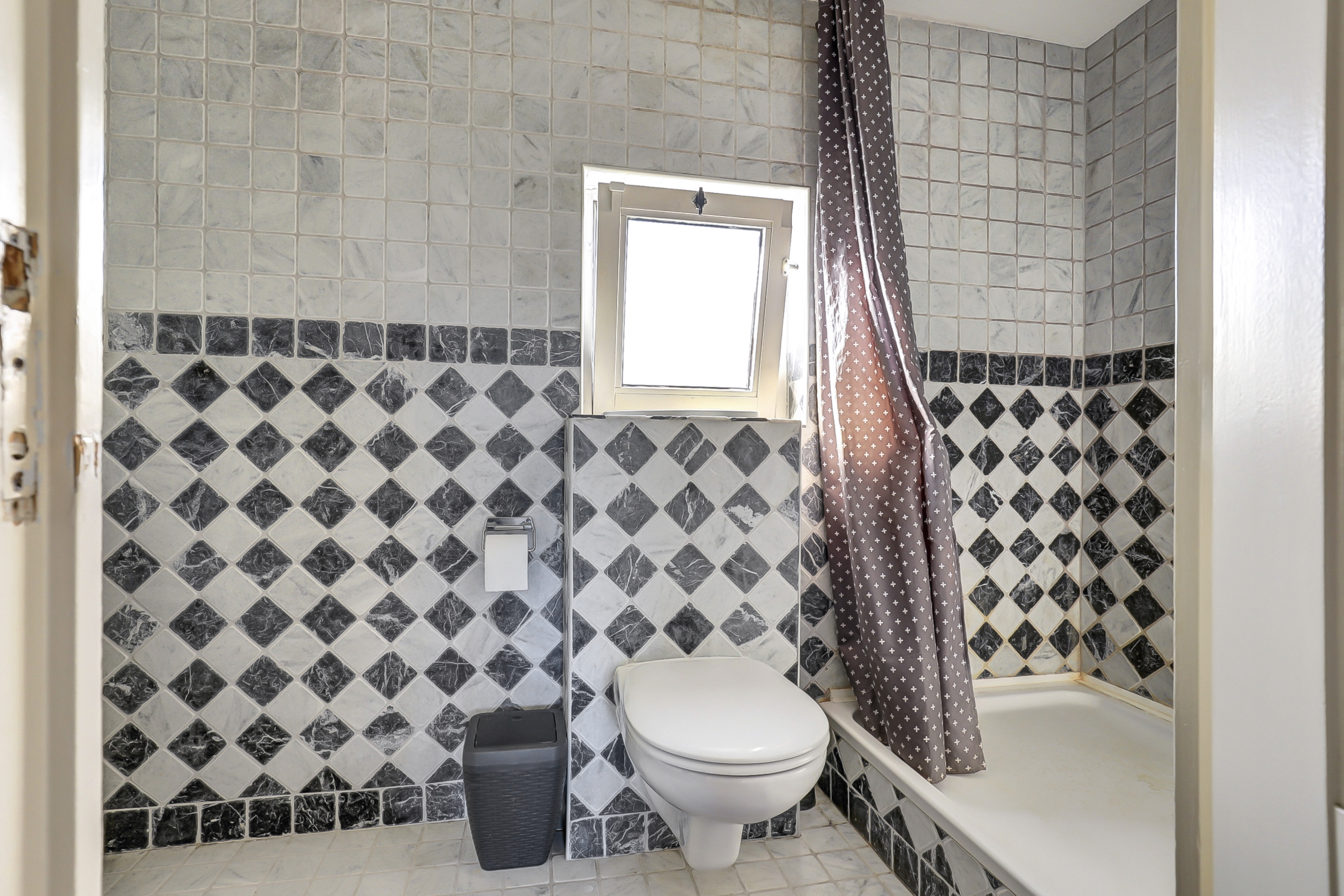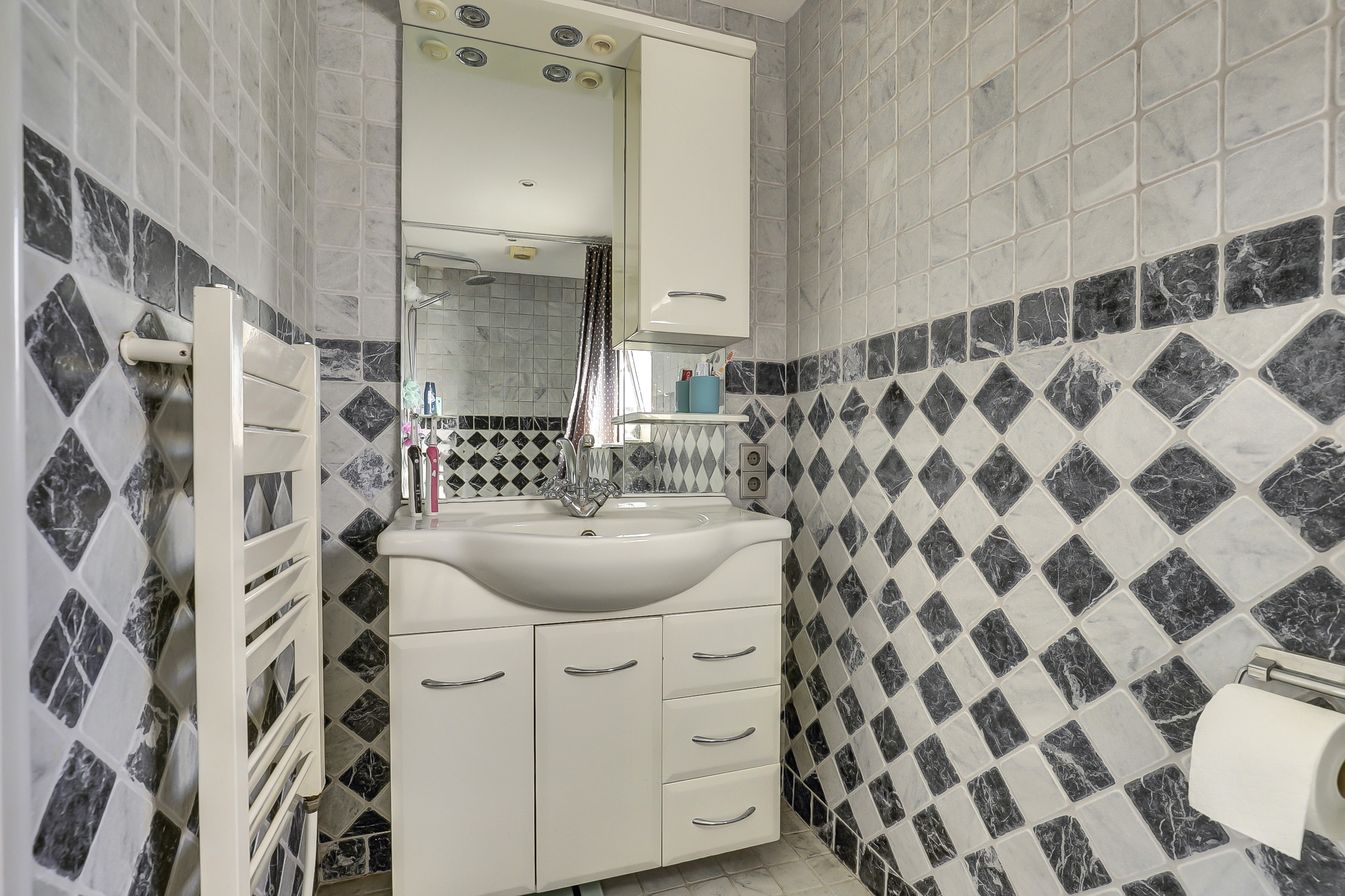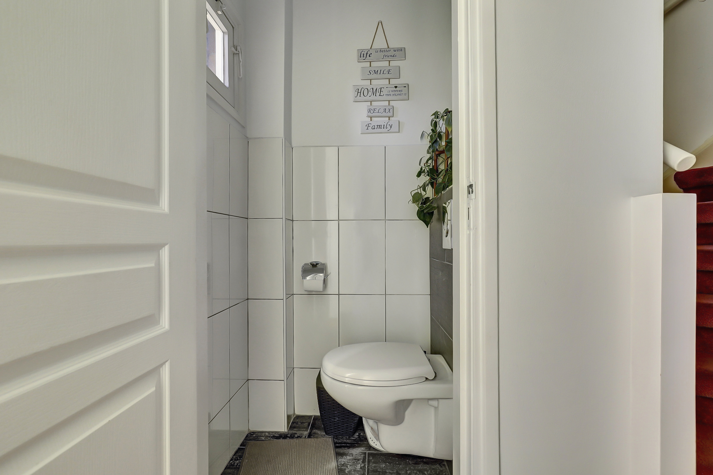 De badkamer, gelegen aan de voorzijde van de woning, is compact maar compleet ingericht met een toilet, wastafel met meubel en een douche – een knusse ruimte die van alle gemakken is voorzien.