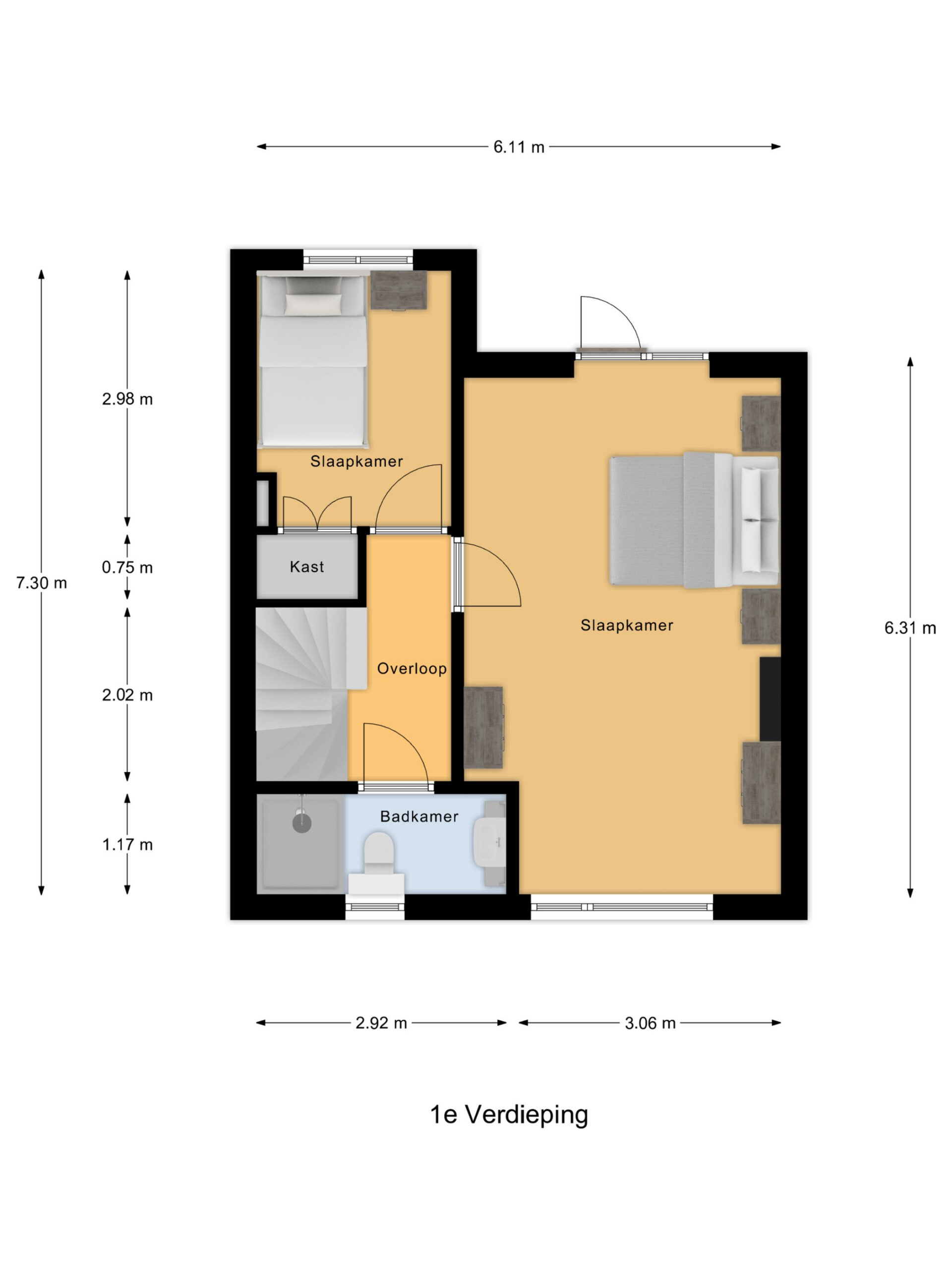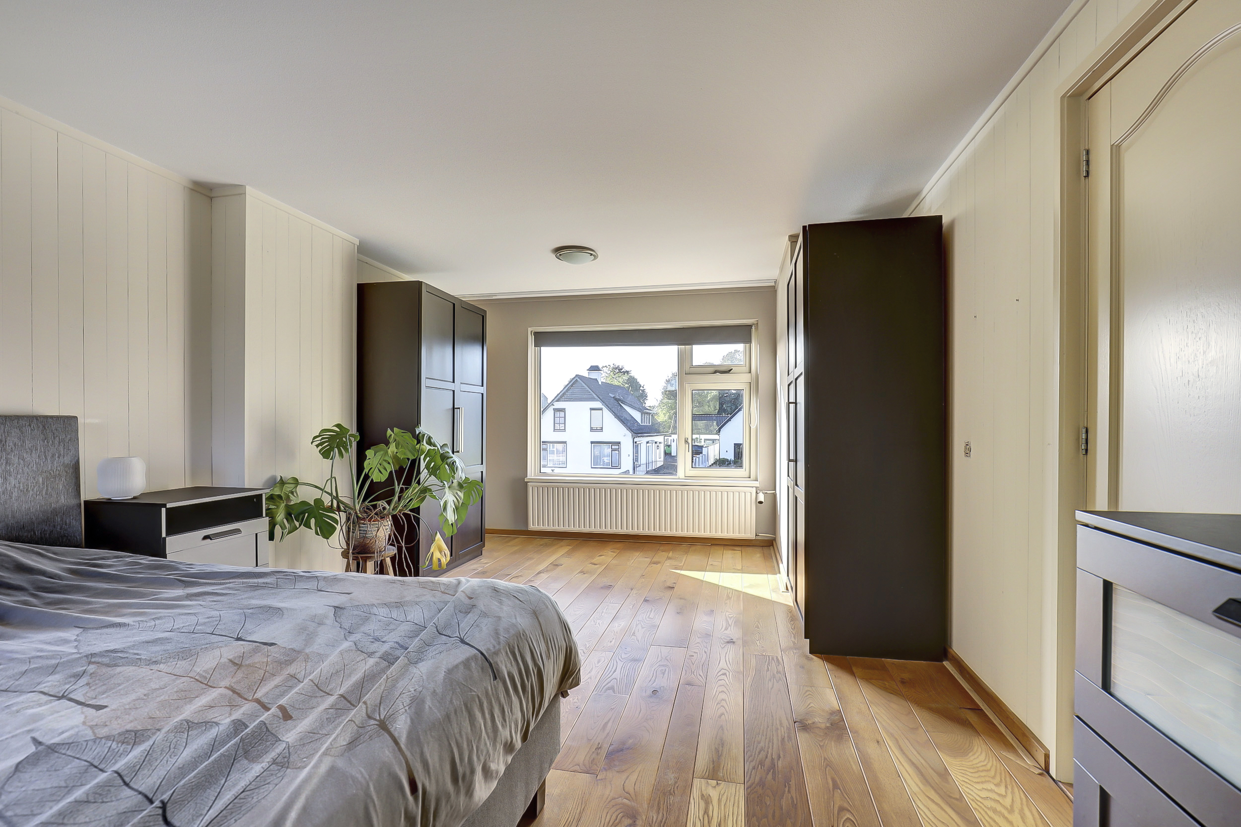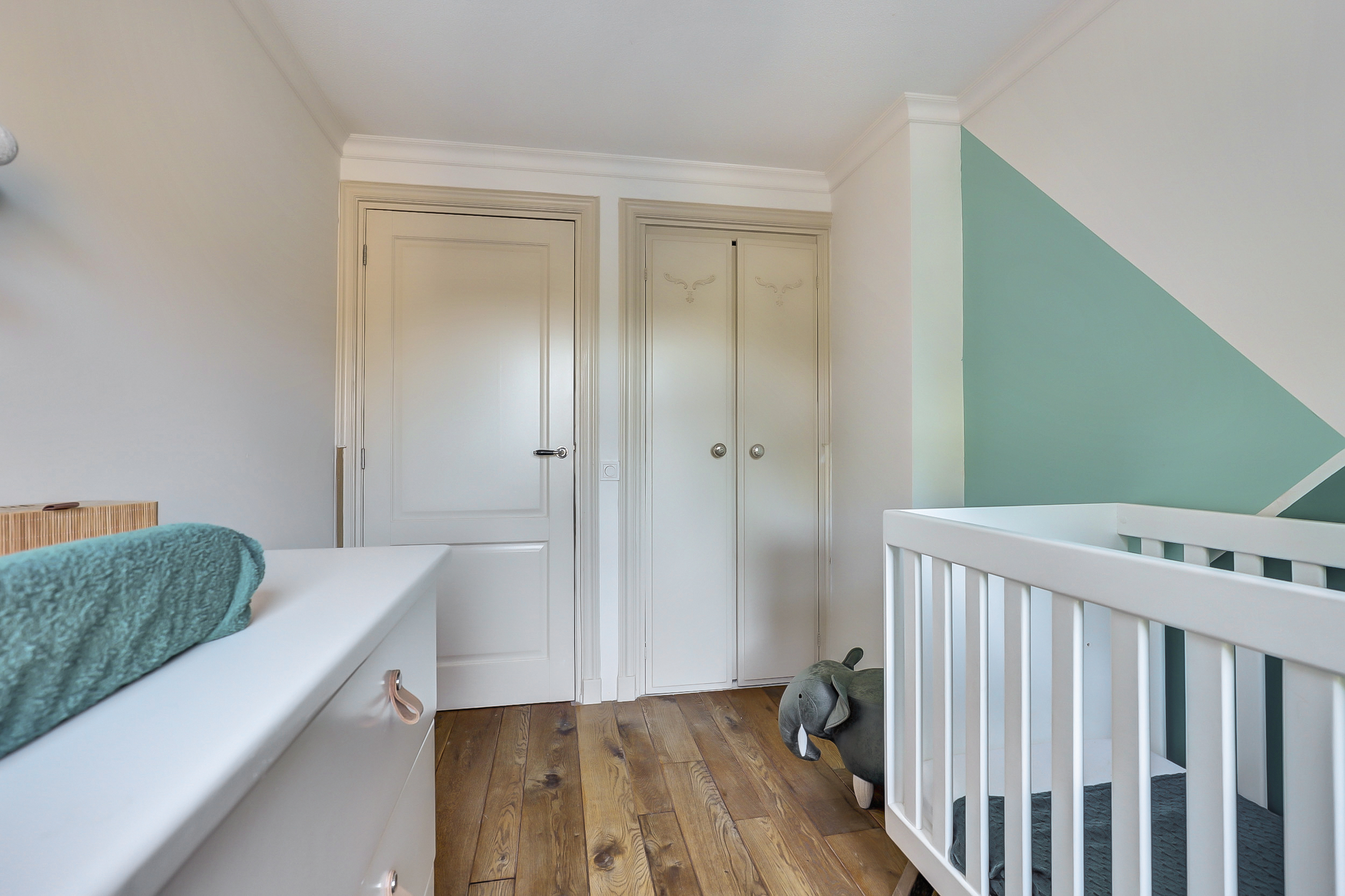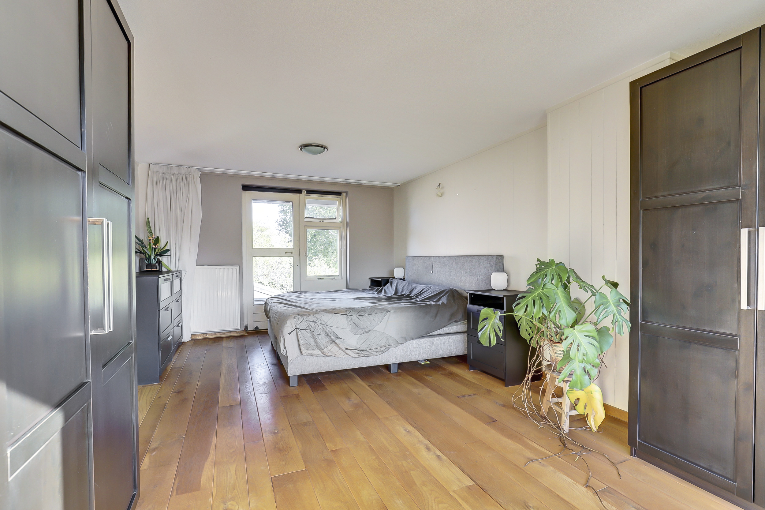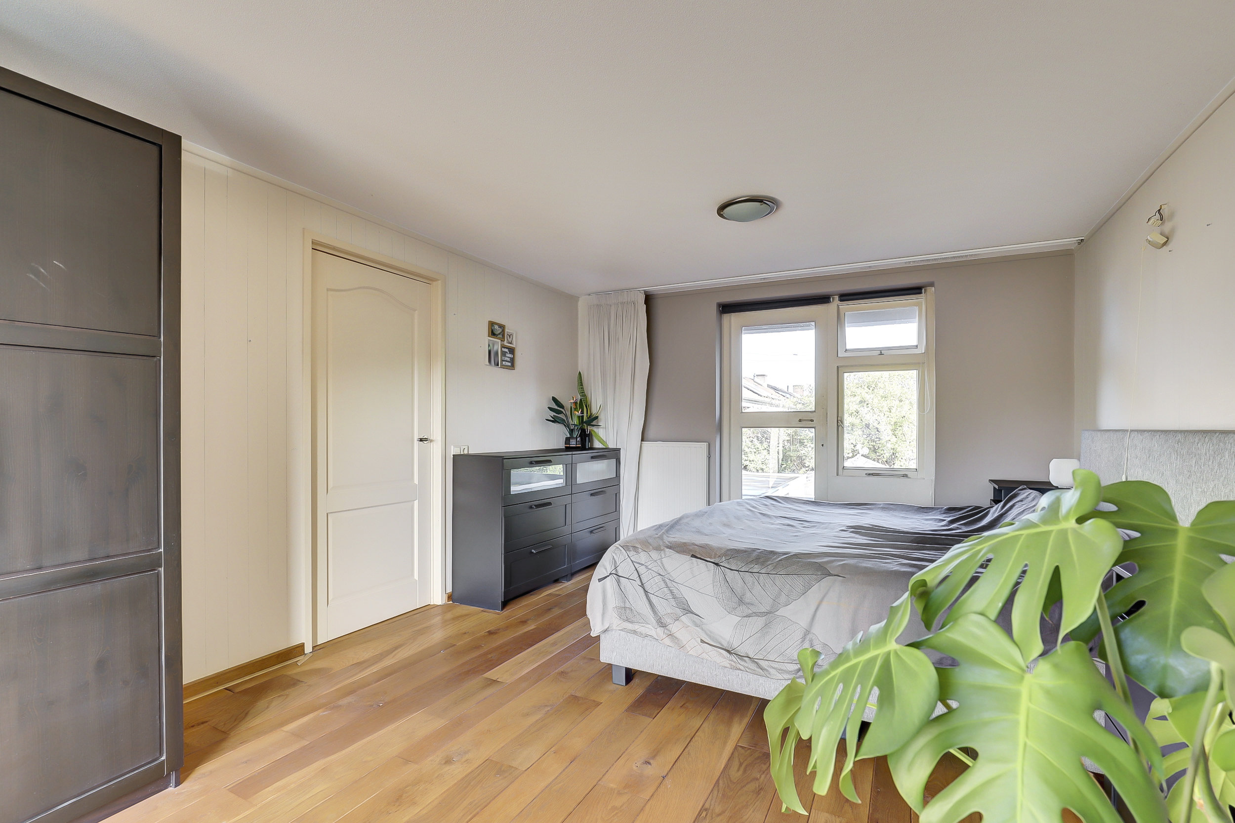 Op de eerste verdieping bevinden zich twee slaapkamers en de badkamer. Voorheen waren dit drie slaapkamers, wat de huidige masterbedroom extra royaal maakt. De tweede slaapkamer, aan de achterzijde, beschikt over een vaste kast en is uitstekend geschikt als kinderkamer, werkkamer of walk-in closet.