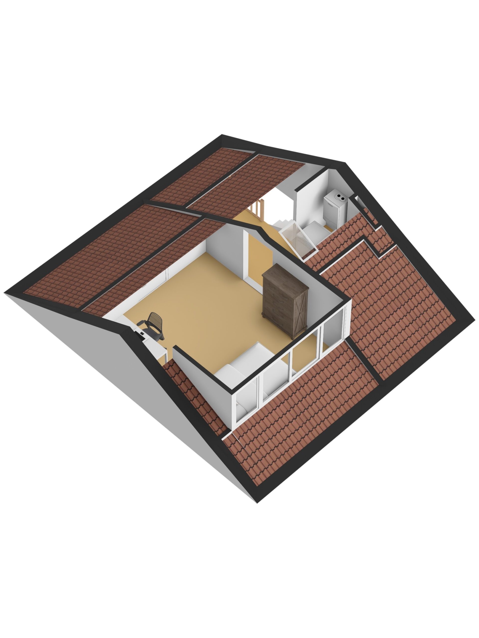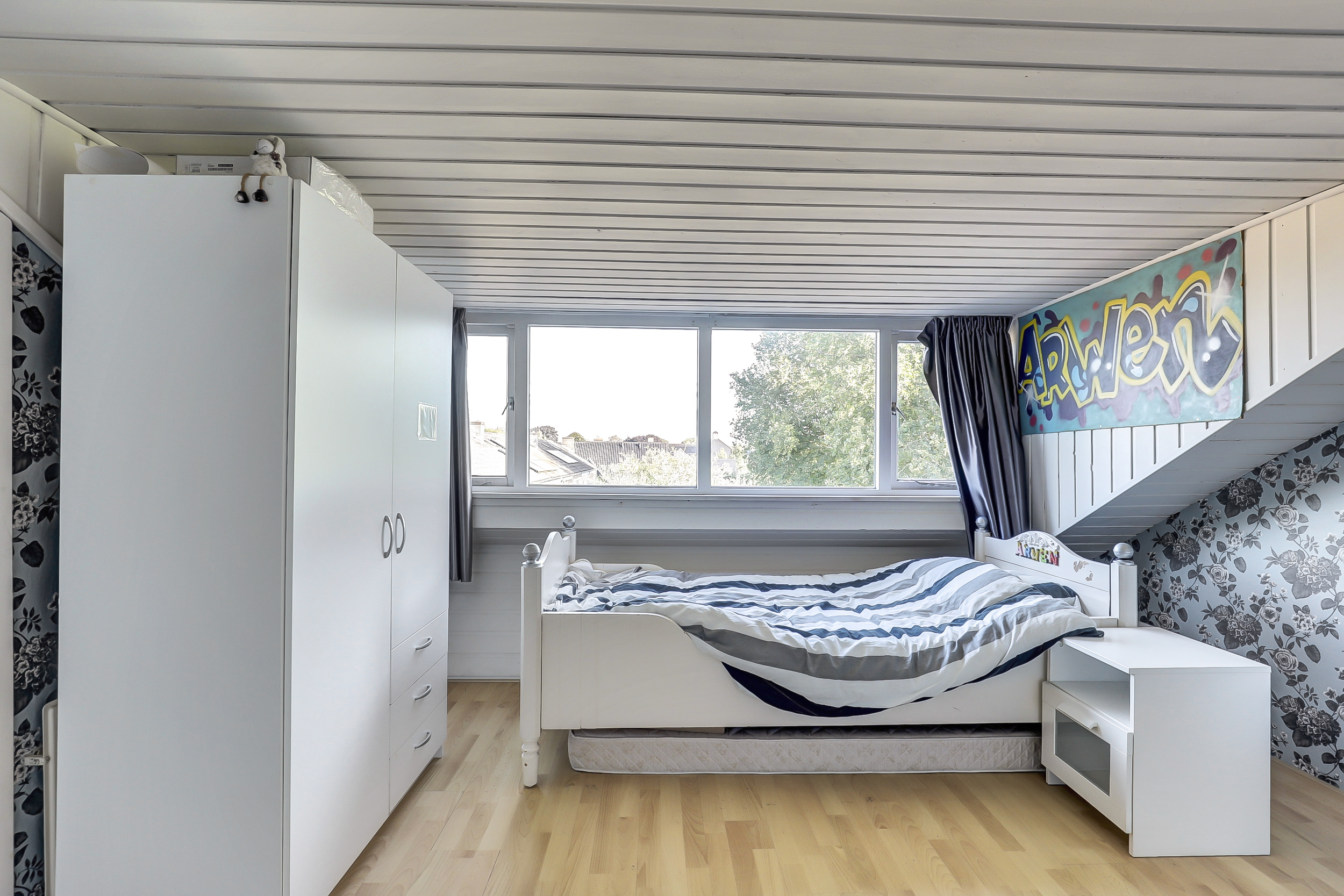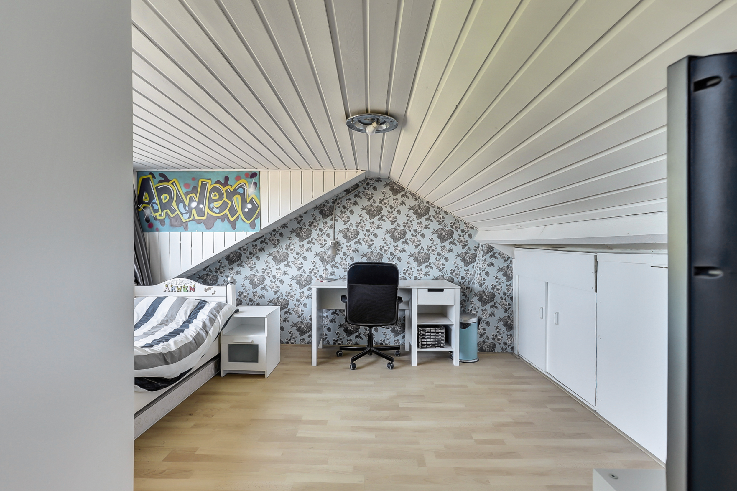 De derde slaapkamer is ruim en licht dankzij de dakkapel aan de achterzijde. Ook is er volop bergruimte achter de knieschotten, wat deze kamer niet alleen royaal maakt, maar ook functioneel. Ideaal als volwaardige slaapkamer, werkkamer of hobbyruimte.